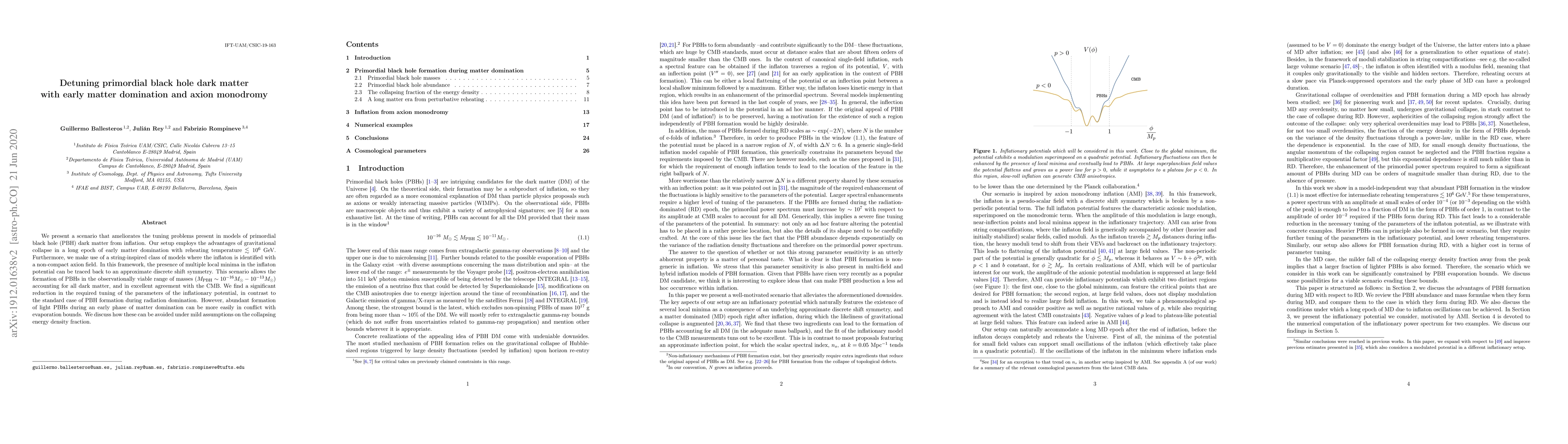 This paper proposes a model to address tuning issues in primordial black hole dark matter formation, leveraging early matter domination and axion monodromy. It suggests that primordial black holes in the viable mass range can form during this period, reducing parameter tuning compared to radiation domination, while discussing potential conflicts with evaporation bounds and how they can be mitigated.