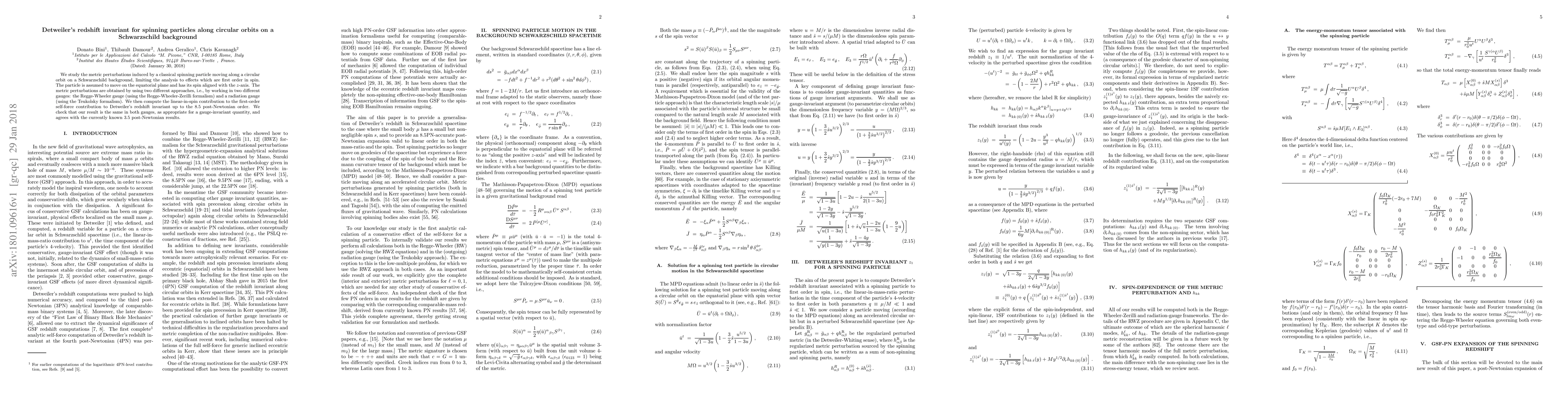We study the metric perturbations induced by a classical spinning particle moving along a circular orbit on a Schwarzschild background, limiting the analysis to effects which are first order in spin. The particle is assumed to move on the equatorial plane and has its spin aligned with the $z$-axis. The metric perturbations are obtained by using two different approaches, i.e., by working in two different gauges: the Regge-Wheeler gauge (using the Regge-Wheeler-Zerilli formalism) and a radiation gauge (using the Teukolsky formalism). We then compute the linear-in-spin contribution to the first-order self-force contribution to Detweiler's redshift invariant up to the 8.5 post-Newtonian order. We check that our result is the same in both gauges, as appropriate for a gauge-invariant quantity, and agrees with the currently known 3.5 post-Newtonian results.