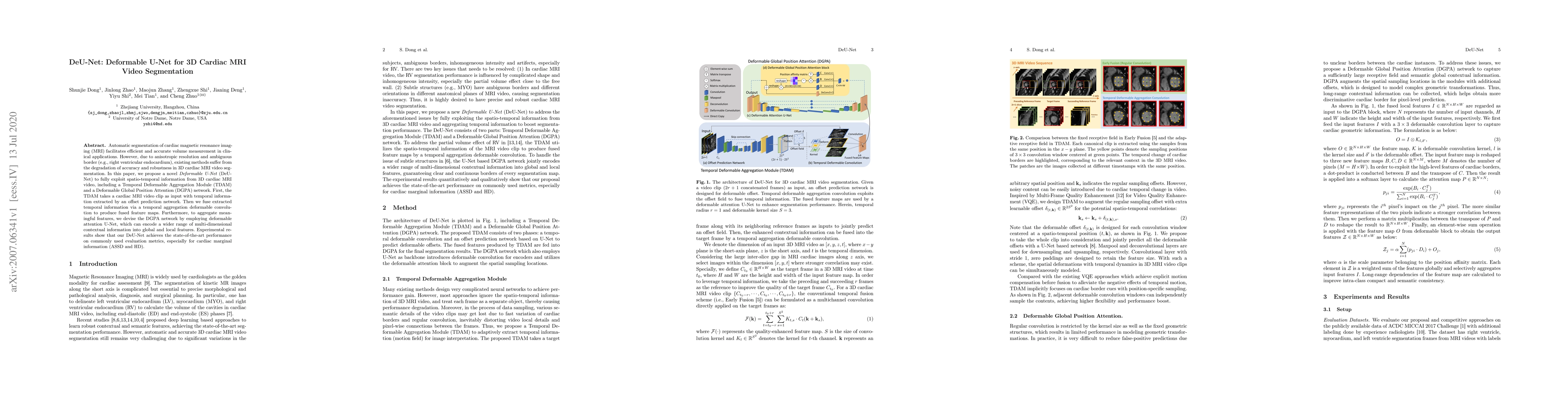 The paper proposes DeU-Net, a novel Deformable U-Net for enhanced 3D cardiac MRI video segmentation, incorporating a Temporal Deformable Aggregation Module and a Deformable Global Position Attention network to improve accuracy and robustness. The DeU-Net achieves state-of-the-art performance on standard evaluation metrics.