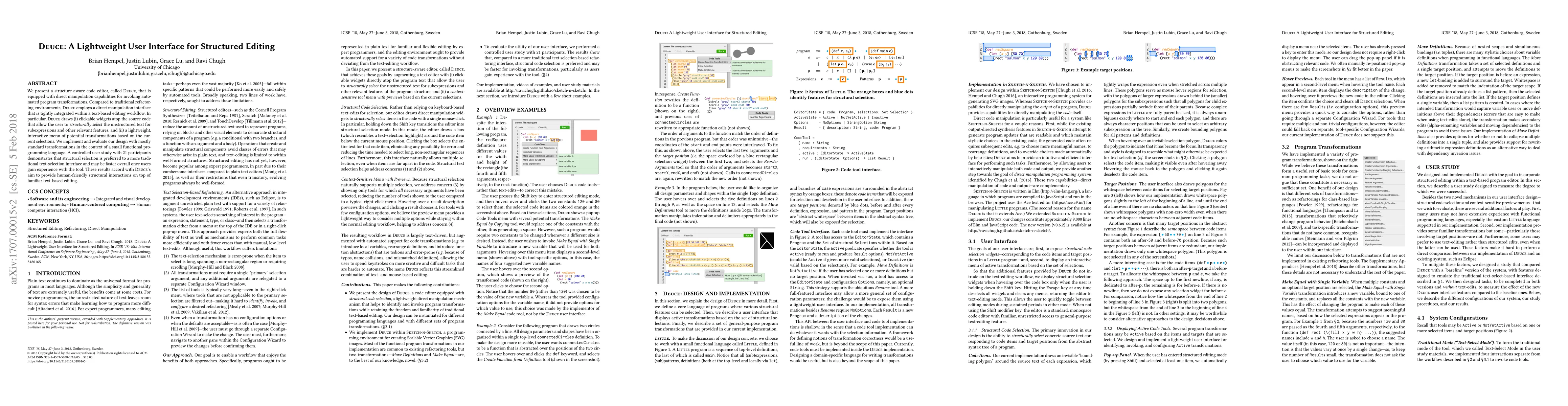 Deuce is a lightweight, structure-aware code editor that uses direct manipulation for automated program transformations, featuring clickable widgets for structural selection over traditional text-based editing. A user study found that structural selection is preferred and can be faster with experience, aligning with Deuce's goal of enhancing text-based editing with human-friendly structural interactions.