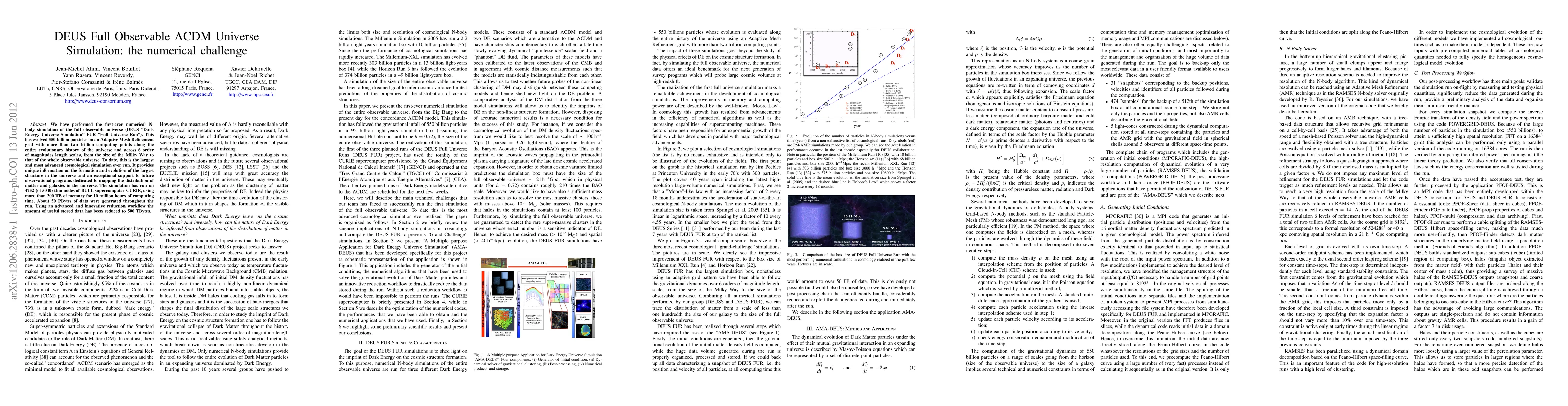 The DEUS simulation is the largest N-body cosmological simulation to date, evolving 550 billion particles across the observable universe's history and scales. It utilized the BULL supercomputer CURIE, generating 50 PBytes of data, which was reduced to 500 TBytes for storage.