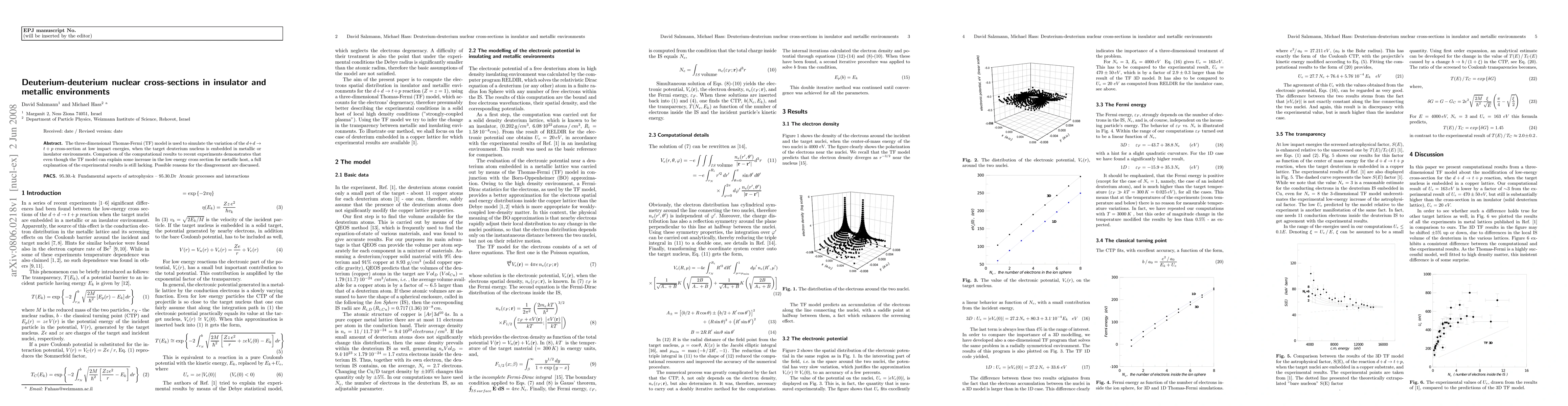 The three-dimensional Thomas-Fermi (TF) model is used to simulate the variation of the d+d to t + p cross-section at low impact energies, when the target deuterium nucleus is embedded in metallic or insulator environments. Comparison of the computational results to recent experiments demonstrates that even though the TF model can explain some increase in the low energy cross section for metallic host, a full explanation of the experimental results is still lacking. Possible reasons for the disagreement are discussed.
