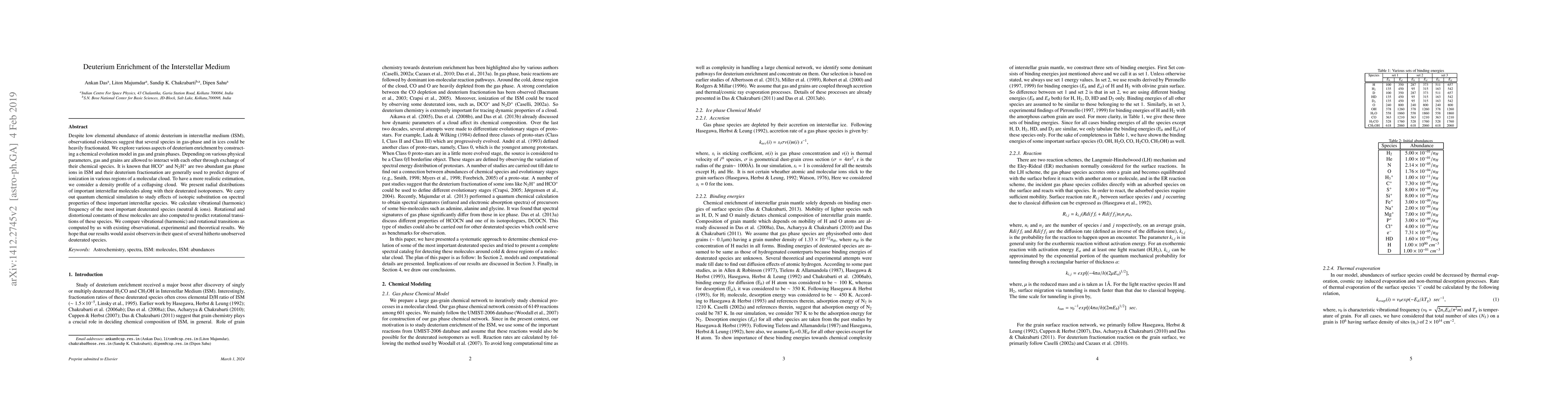 Despite low elemental abundance of atomic deuterium in interstellar medium (ISM), observational evidences suggest that several species in gas-phase and in ices could be heavily fractionated. We explore various aspects of deuterium enrichment by constructing a chemical evolution model in gas and grain phases. Depending on various physical parameters, gas and grains are allowed to interact with each other through exchange of their chemical species. It is known that HCO+ and N2H+ are two abundant gas phase ions in ISM and their deuterium fractionation are generally used to predict degree of ionization in various regions of a molecular cloud. To have a more realistic estimation, we consider a density profile of a collapsing cloud. We present radial distributions of important interstellar molecules along with their deuterated isotopomers. We carry out quantum chemical simulation to study effects of isotopic substitution on spectral properties of these important interstellar species. We calculate vibrational (harmonic) frequency of the most important deuterated species (neutral & ions). Rotational and distortional constants of these molecules are also computed to predict rotational transitions of these species. We compare vibrational (harmonic) and rotational transitions as computed by us with existing observational, experimental and theoretical results. We hope that our results would assist observers in their quest of several hitherto unobserved deuterated species.