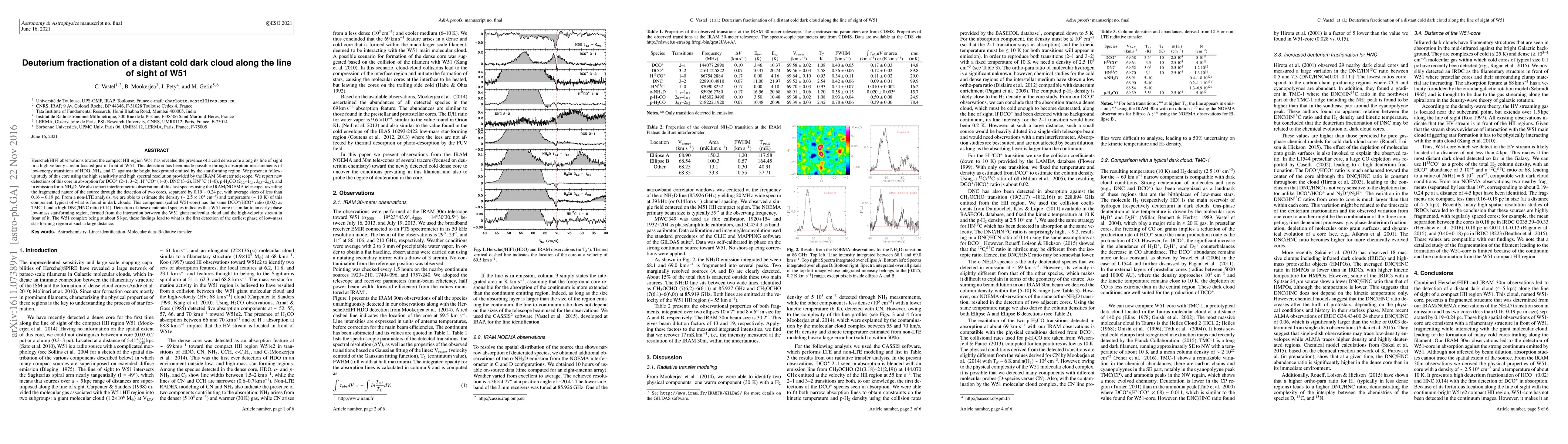 Herschel/HIFI observations toward the compact HII region W51 has revealed the presence of a cold dense core along its line of sight in a high-velocity stream located just in front of W51. This detection has been made possible through absorption measurements of low-energy transitions of HDO, NH3, and C3 against the bright background emitted by the star-forming region. We present a follow-up study of this core using the high sensitivity and high spectral resolution provided by the IRAM 30-meter telescope. We report new detections of this core in absorption for DCO+ (2-1, 3-2), H13CO+ (1-0), DNC (3-2), HN13C (1-0), p-H2CO (202-101, 303-202), and in emission for o-NH2D. We also report interferometric observation of this last species using the IRAM/NOEMA telescope, revealing the fragmented nature of the source through the detection of two cores, separated by 0.19 - 0.24 pc, with average sizes of less than 0.16 - 0.19 pc. From a non-LTE analysis, we are able to estimate the density (~2.5e4 cm-3) and temperature (~10 K) of this component, typical of what is found in dark clouds. This component (called W51-core) has the same DCO+/HCO+ ratio (0.02) as TMC-1 and a high DNC/HNC ratio (0.14). Detection of these deuterated species indicates that W51-core is similar to an early-phase low-mass star-forming region, formed from the interaction between the W51 giant molecular cloud and the high-velocity stream in front of it. The W51 complex being at about 5 kpc, these findings lead to what is the first detection of the earliest phase of low-mass star-forming region at such a large distance.