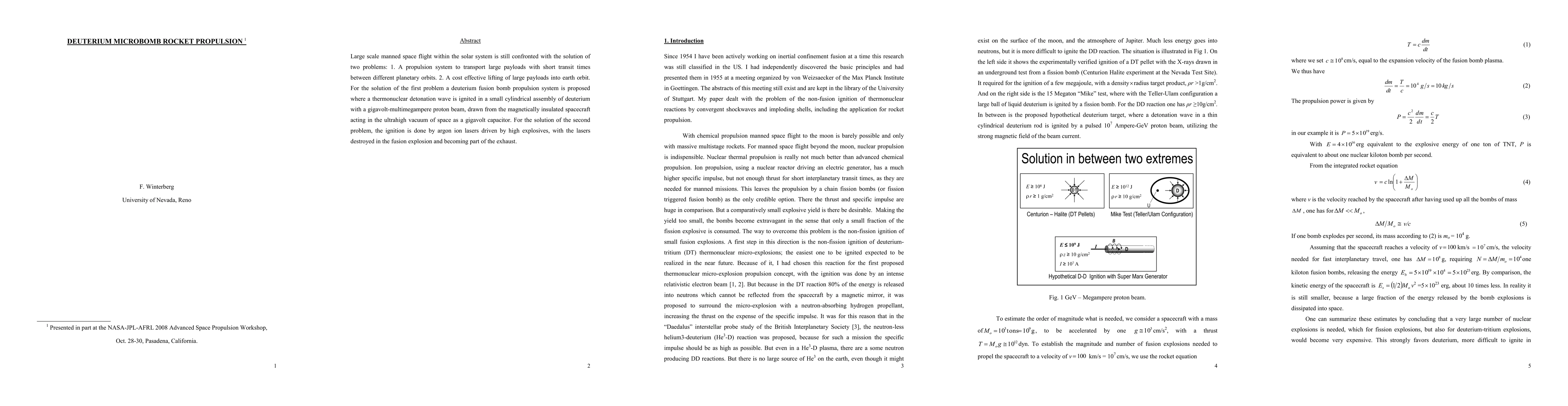 Large scale manned space flight within the solar system is still confronted with the solution of two problems: 1. A propulsion system to transport large payloads with short transit times between different planetary orbits. 2. A cost effective lifting of large payloads into earth orbit. For the solution of the first problem a deuterium fusion bomb propulsion system is proposed where a thermonuclear detonation wave is ignited in a small cylindrical assembly of deuterium with a gigavolt-multimegampere proton beam, drawn from the magnetically insulated spacecraft acting in the ultrahigh vacuum of space as a gigavolt capacitor. For the solution of the second problem, the ignition is done by argon ion lasers driven by high explosives, with the lasers destroyed in the fusion explosion and becoming part of the exhaust.
