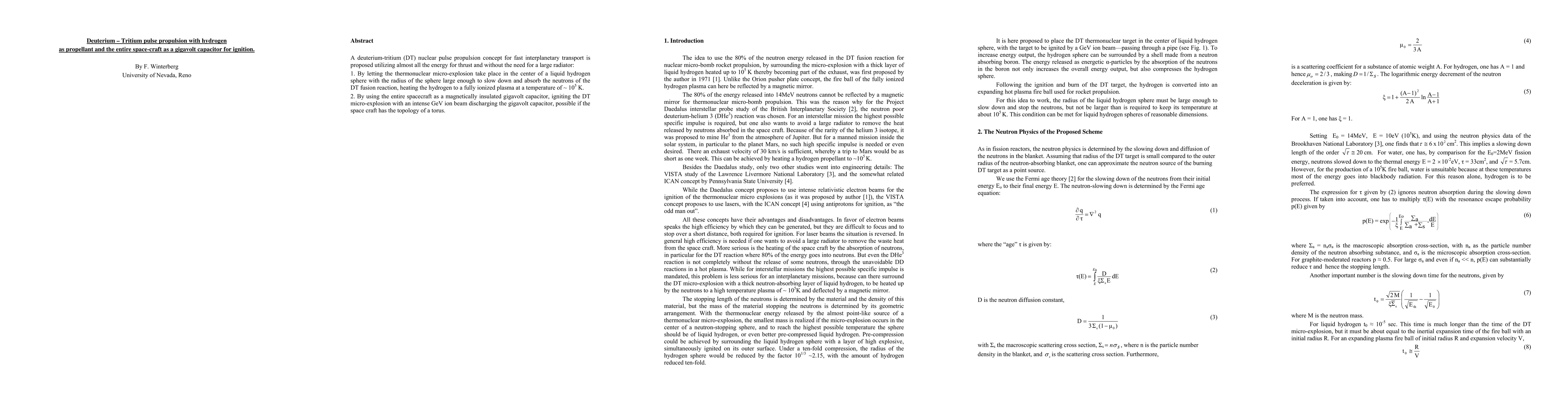 This paper proposes a DT nuclear pulse propulsion concept for rapid interplanetary travel, utilizing hydrogen as propellant and the spacecraft as a gigavolt capacitor. The method involves igniting DT micro-explosions in a liquid hydrogen sphere, heating it to plasma, and employing a toroidal spacecraft to discharge the capacitor for ignition.