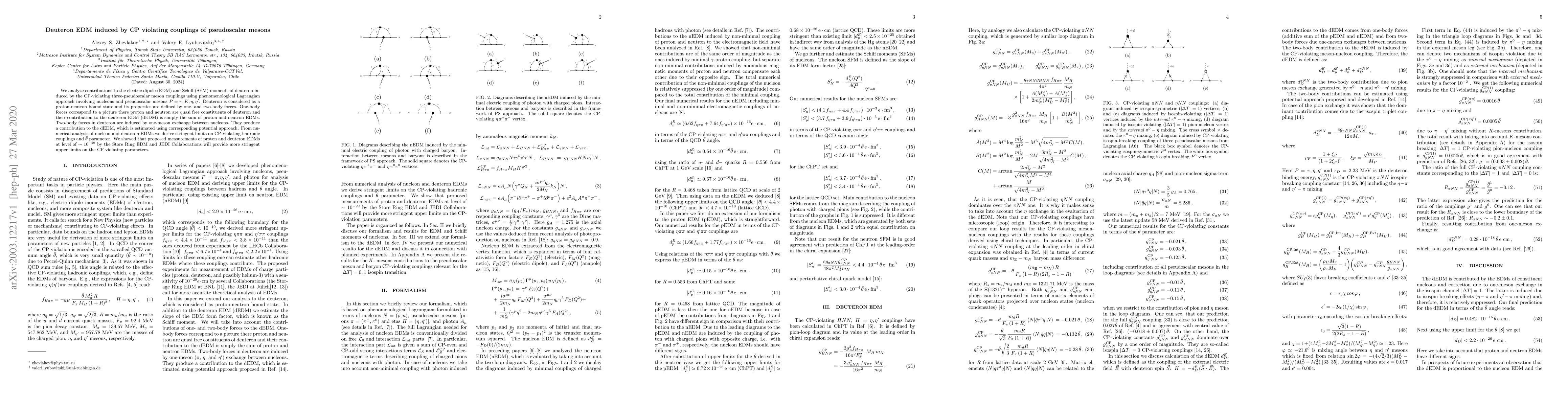 This paper investigates the electric dipole moment (EDM) of deuteron induced by CP-violating three-pseudoscalar meson couplings, estimating contributions from both one- and two-body forces. The study proposes that precise measurements of proton and deuteron EDMs could yield stringent limits on CP-violating hadronic couplings and the $\bar\theta$ parameter.