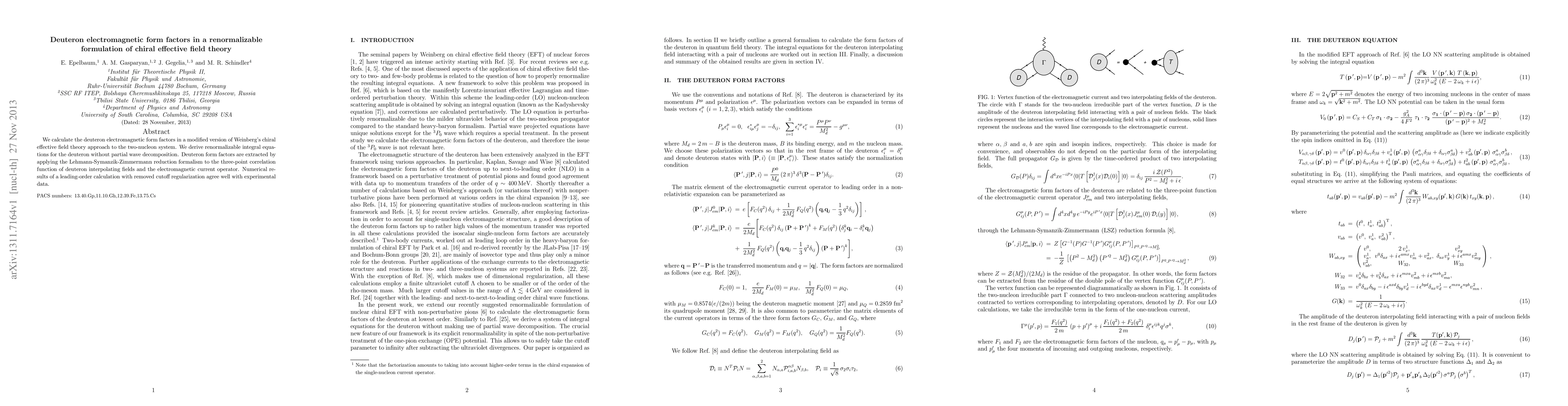 This paper calculates the deuteron electromagnetic form factors using a renormalizable version of chiral effective field theory, deriving integral equations without partial wave decomposition and employing the Lehmann-Symanzik-Zimmermann reduction formalism. The leading-order numerical results show good agreement with experimental data.