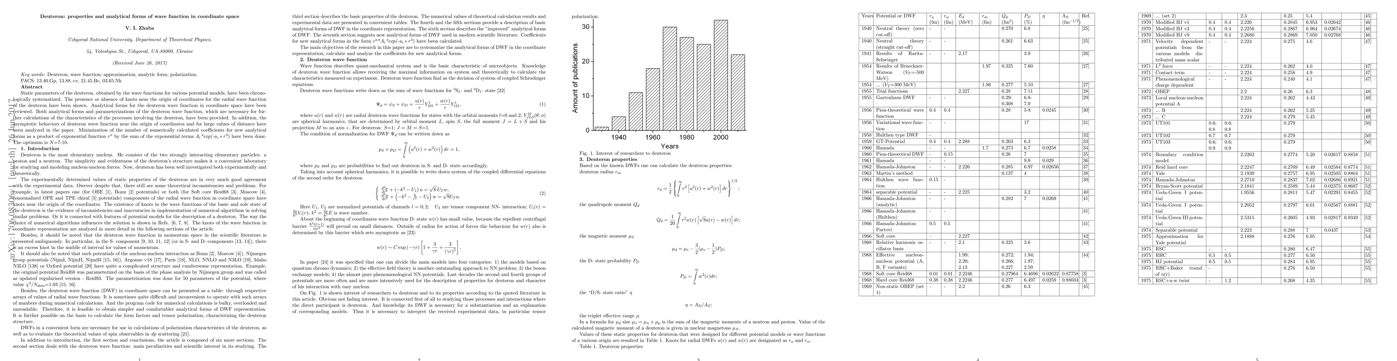 Static parameters of the deuteron, obtained by the wave functions for various potential models, have been chronologically systematized. The presence or absence of knots near the origin of coordinates for the radial wave function of the deuteron have been shown. Analytical forms for the deuteron wave function in coordinate space have been reviewed. Both analytical forms and parameterizations of the deuteron wave function, which are necessary for further calculations of the characteristics of the processes involving the deuteron, have been provided. In addition, the asymptotic behaviors of deuteron wave function near the origin of coordinates and for large values of distance have been analyzed in the paper. Minimization of the number of numerically calculated coefficients for new analytical forms as a product of exponential function r^n by the sum of the exponential terms Ai*exp(-ai*r^3) have been done. The optimum is N=7-10.