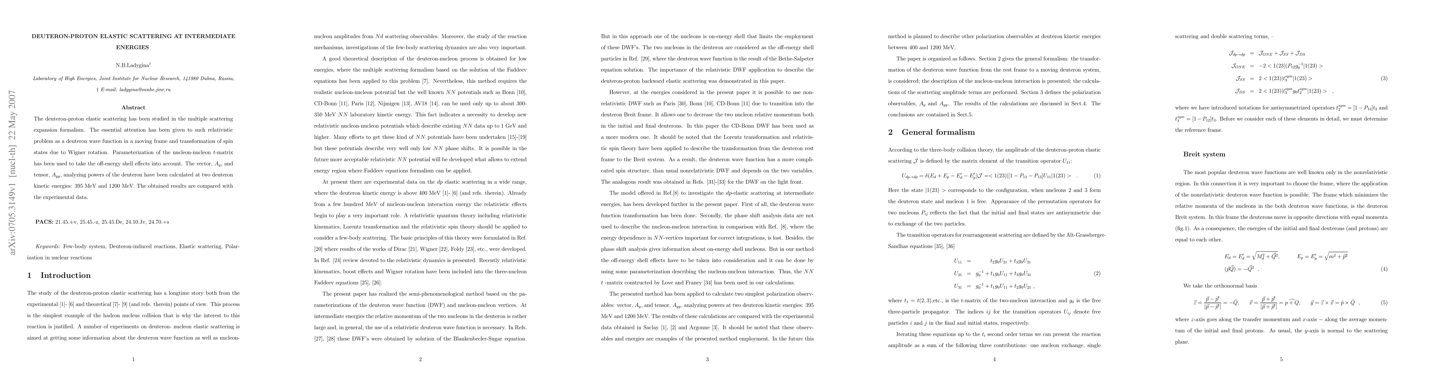The research methodology involves studying deuteron-proton elastic scattering at intermediate energies using the multiple scattering expansion formalism. It considers relativistic effects, such as the deuteron wave function in a moving frame and Wigner rotation for spin state transformation. Off-energy shell effects are accounted for using a parameterization of the nucleon-nucleon $t$-matrix.