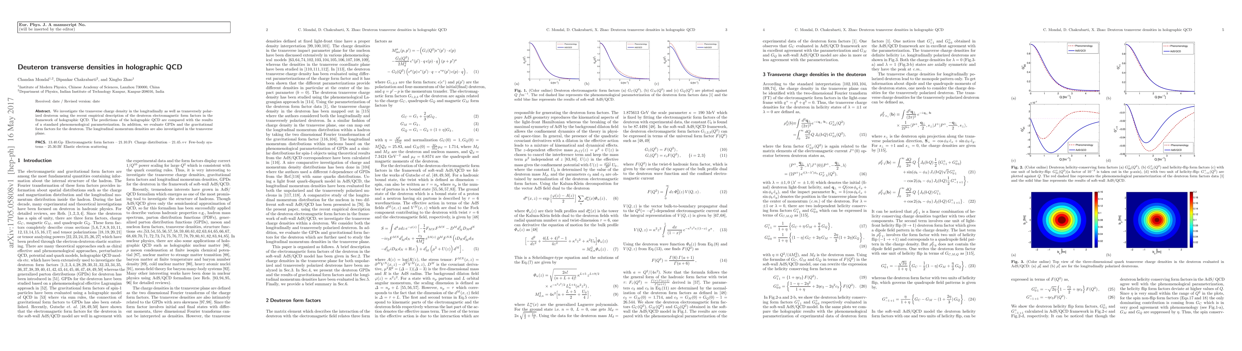 This paper explores the transverse charge density of the deuteron in both longitudinal and transverse polarizations using holographic QCD, comparing its predictions with standard phenomenological models and evaluating gravitational form factors and generalized parton distributions (GPDs).