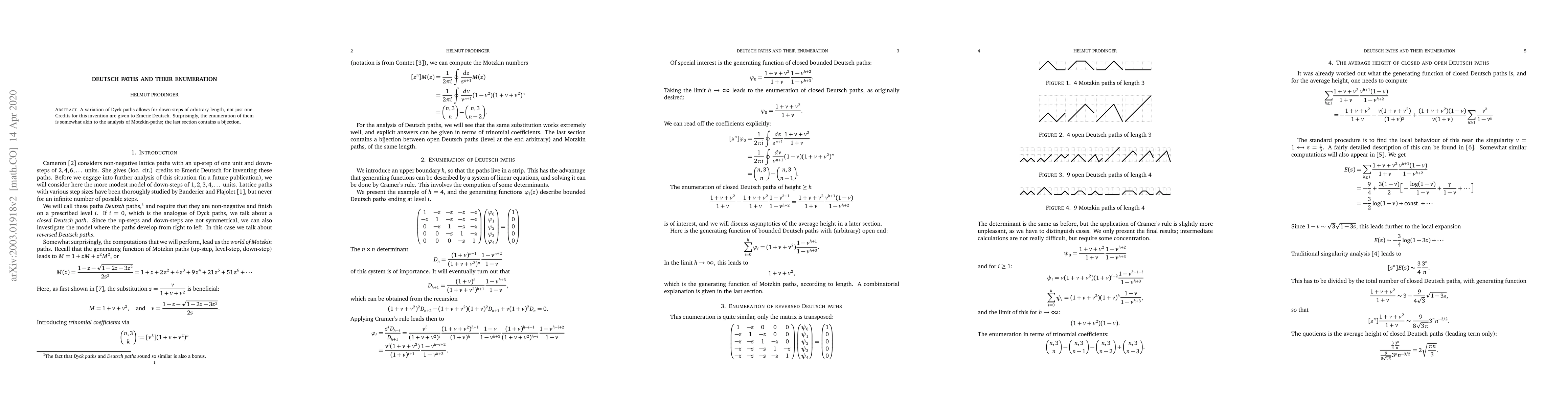 A variation of Dyck paths allows for down-steps of arbitrary length, not just one. Credits for this invention are given to Emeric Deutsch. Surprisingly, the enumeration of them is somewhat akin to the analysis of Motzkin-paths; the last section contains a bijection.