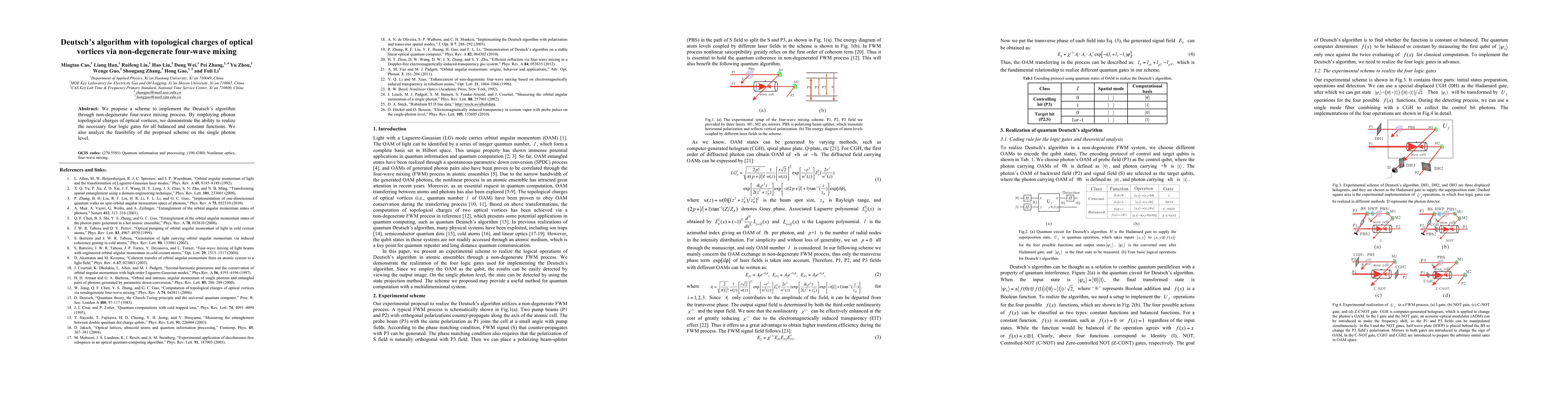 Summary: This paper proposes a method to implement Deutsch's algorithm using non-degenerate four-wave mixing and optical vortex topological charges, demonstrating the realization of four logic gates for balanced and constant functions, and analyzes its feasibility at the single photon level.