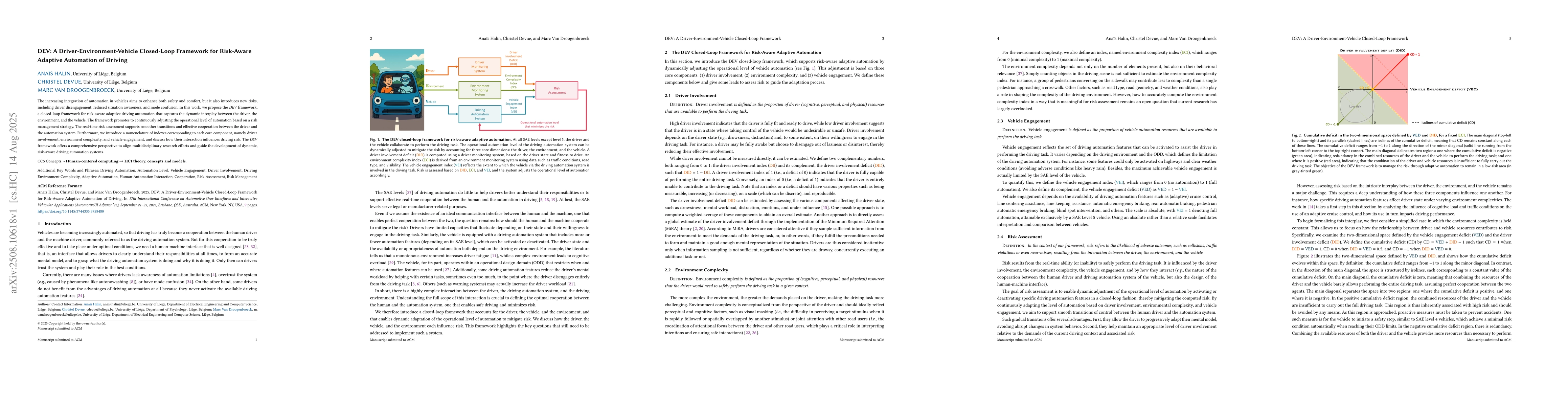 The increasing integration of automation in vehicles aims to enhance both safety and comfort, but it also introduces new risks, including driver disengagement, reduced situation awareness, and mode confusion. In this work, we propose the DEV framework, a closed-loop framework for risk-aware adaptive driving automation that captures the dynamic interplay between the driver, the environment, and the vehicle. The framework promotes to continuously adjusting the operational level of automation based on a risk management strategy. The real-time risk assessment supports smoother transitions and effective cooperation between the driver and the automation system. Furthermore, we introduce a nomenclature of indexes corresponding to each core component, namely driver involvement, environment complexity, and vehicle engagement, and discuss how their interaction influences driving risk. The DEV framework offers a comprehensive perspective to align multidisciplinary research efforts and guide the development of dynamic, risk-aware driving automation systems.