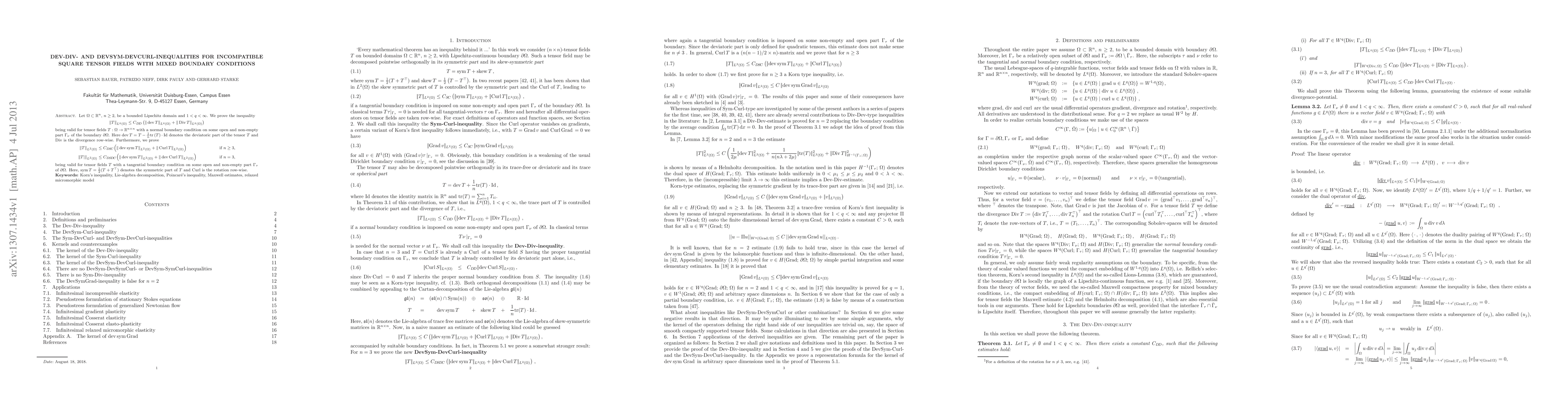 For an n-dimensional bounded domain we derive some inequalities bounding the norm of a square tensor field. Concerning the Div-Dev-inequality the bound is given by the trace-free part and the divergence and the tensor. In the case of the DevSym-Curl-inequality the bound is given by the trace-free and symmetric part and the curl of the tensor. For n=3 the bound is given by the trace-free symmetric part of the tensor and the trace-free part of the curl of the tensor. Some prototype applications are presented in which the new inequalities may be used to derive the coercivity of the models.