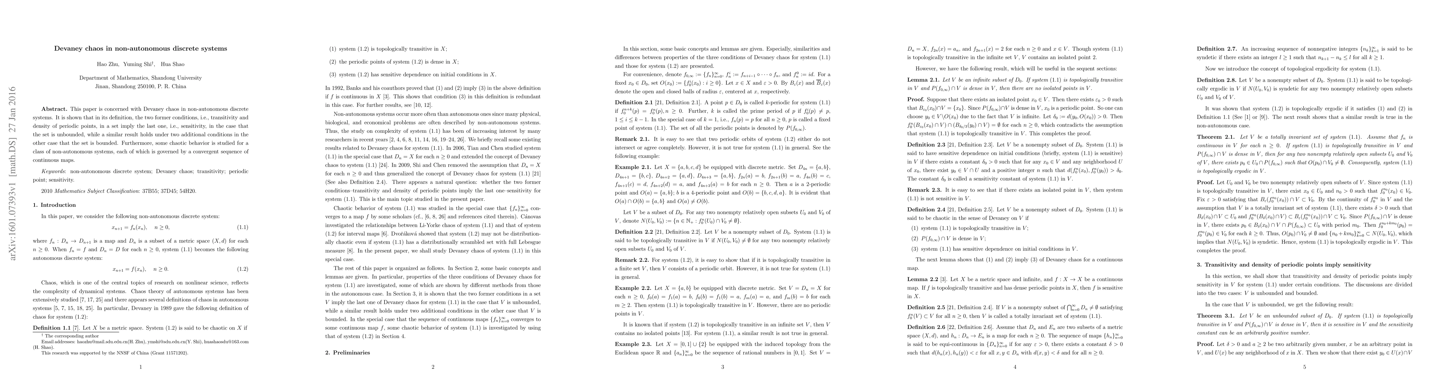This paper explores Devaney chaos in non-autonomous discrete systems, demonstrating that transitivity and density of periodic points imply sensitivity when the set is unbounded. It also examines chaotic behavior under additional conditions for bounded sets.