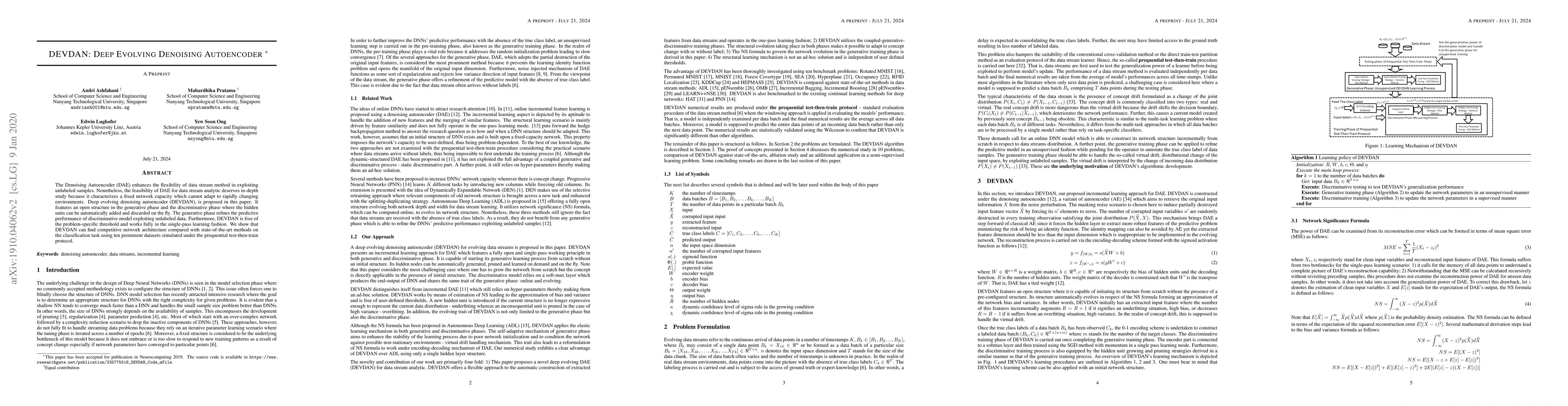 The Deep Evolving Denoising Autoencoder (DEVDAN) adapts to changing environments by dynamically adding and removing hidden units, outperforming state-of-the-art methods on various classification tasks.
