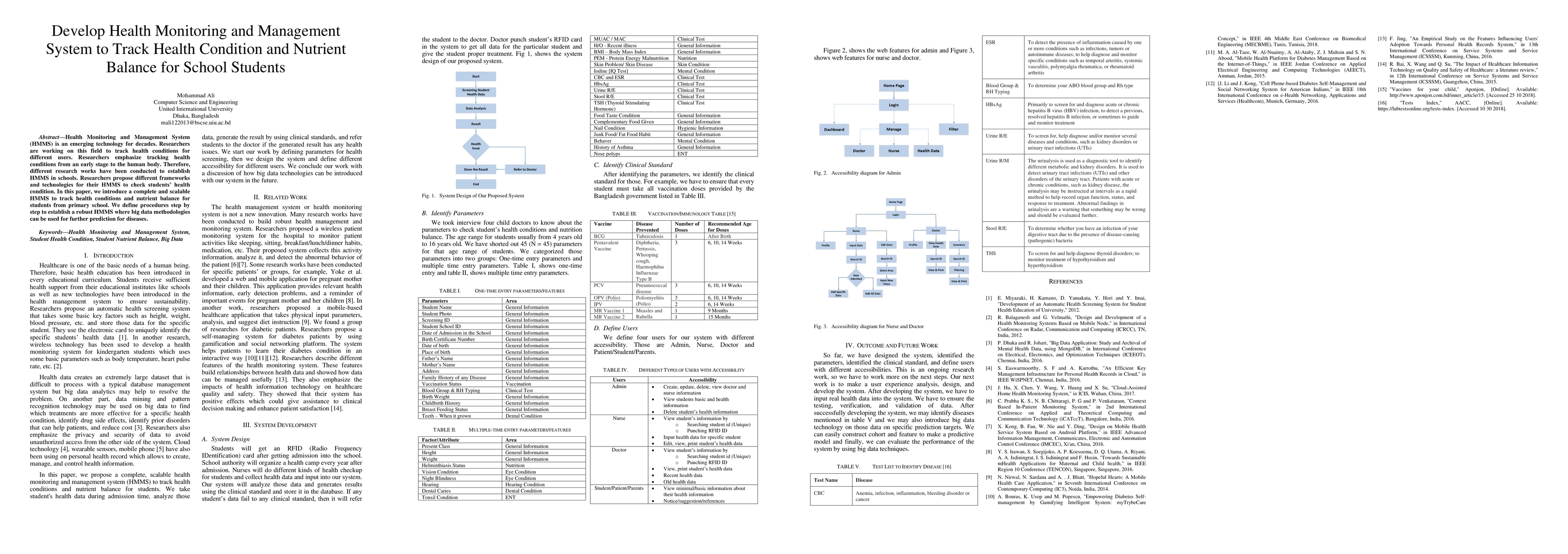 A health monitoring system is developed to track students' health conditions and nutrient balance in primary schools, using a scalable framework and big data methodologies for disease prediction.