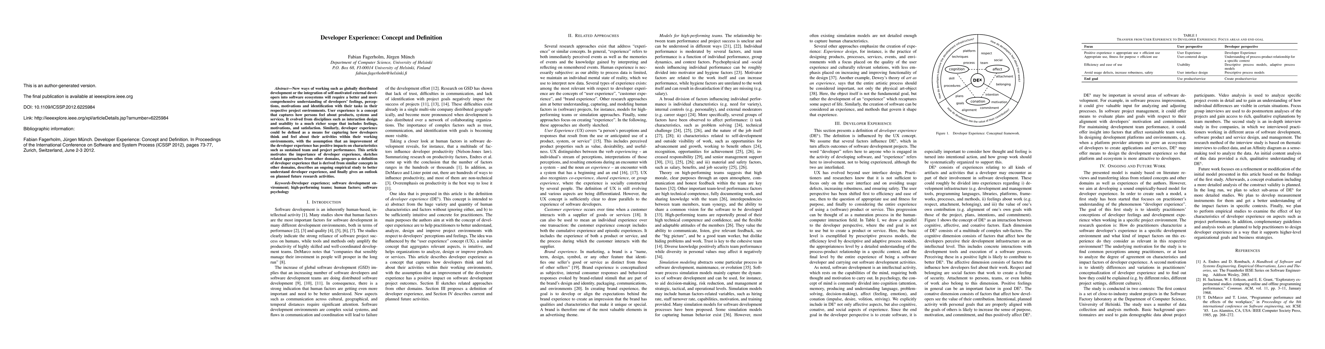 This paper defines developer experience as a comprehensive understanding of developers' feelings, perceptions, and motivations in their working environments, positing that it positively impacts team and project performance. It outlines the importance of this concept and proposes future research directions based on ongoing empirical studies.