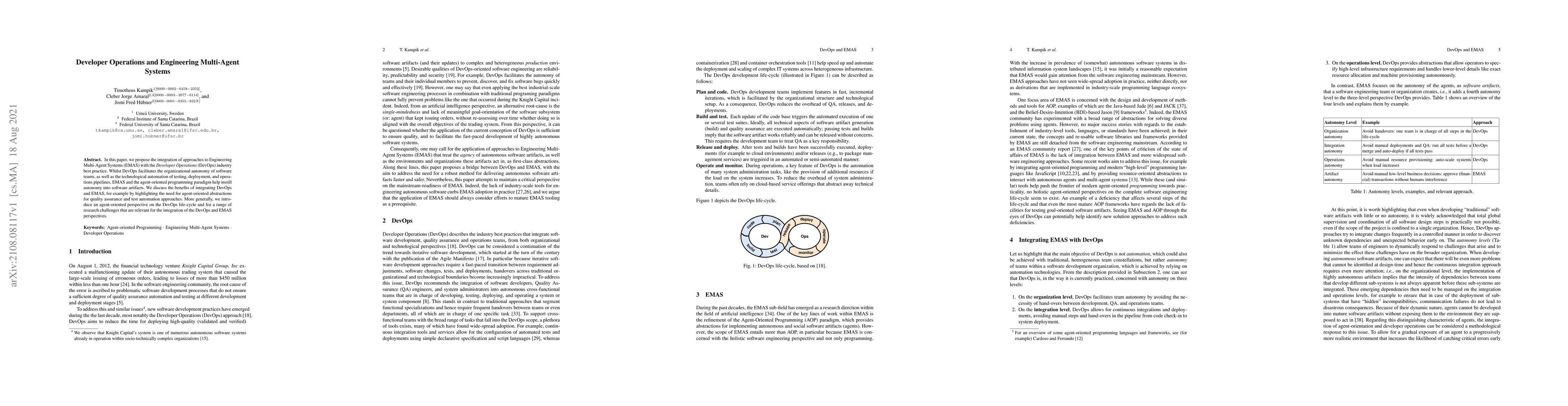 In this paper, we propose the integration of approaches to Engineering Multi-Agent Systems (EMAS) with the Developer Operations (DevOps) industry best practice. Whilst DevOps facilitates the organizational autonomy of software teams, as well as the technological automation of testing, deployment, and operations pipelines, EMAS and the agent-oriented programming paradigm help instill autonomy into software artifacts. We discuss the benefits of integrating DevOps and EMAS, for example by highlighting the need for agent-oriented abstractions for quality assurance and test automation approaches. More generally, we introduce an agent-oriented perspective on the DevOps life-cycle and list a range of research challenges that are relevant for the integration of the DevOps and EMAS perspectives.
