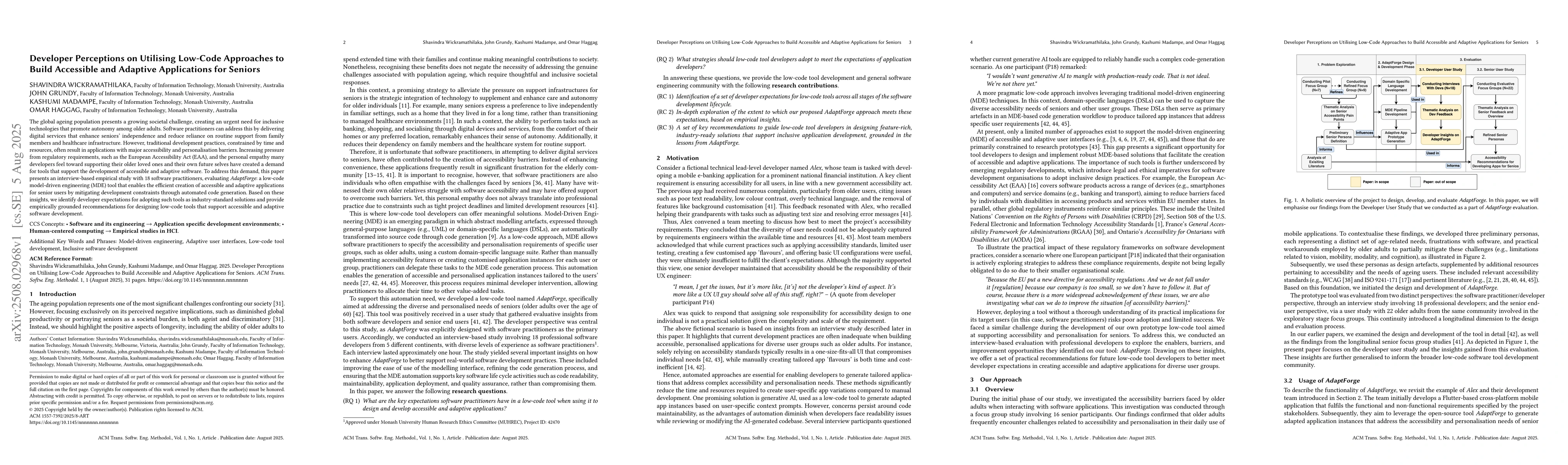 This research distinguishes itself by focusing on developer perceptions and expectations regarding low-code tools for building accessible and adaptive applications for seniors, providing empirically grounded recommendations for designing such tools.
