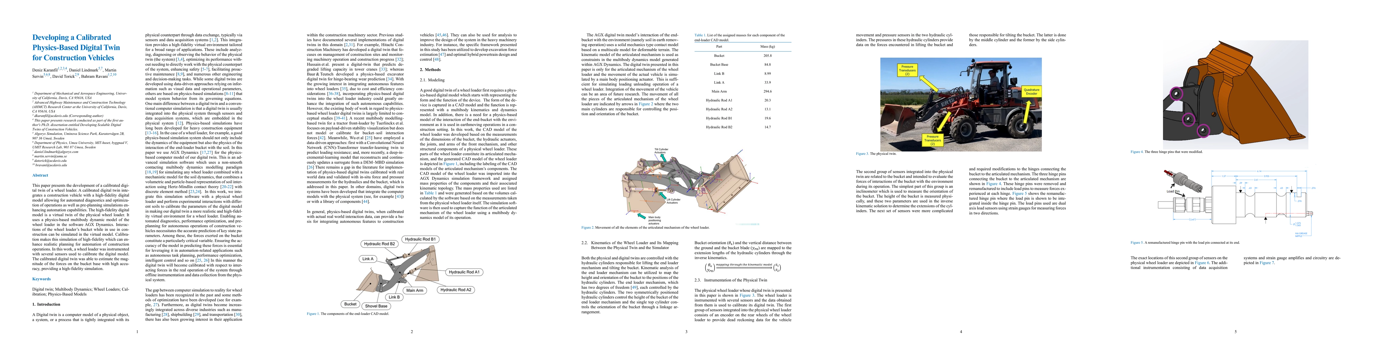 This paper presents the development of a calibrated digital twin of a wheel loader. A calibrated digital twin integrates a construction vehicle with a high-fidelity digital model allowing for automated diagnostics and optimization of operations as well as pre-planning simulations enhancing automation capabilities. The high-fidelity digital model is a virtual twin of the physical wheel loader. It uses a physics-based multibody dynamic model of the wheel loader in the software AGX Dynamics. Interactions of the wheel loader's bucket while in use in construction can be simulated in the virtual model. Calibration makes this simulation of high-fidelity which can enhance realistic planning for automation of construction operations. In this work, a wheel loader was instrumented with several sensors used to calibrate the digital model. The calibrated digital twin was able to estimate the magnitude of the forces on the bucket base with high accuracy, providing a high-fidelity simulation.