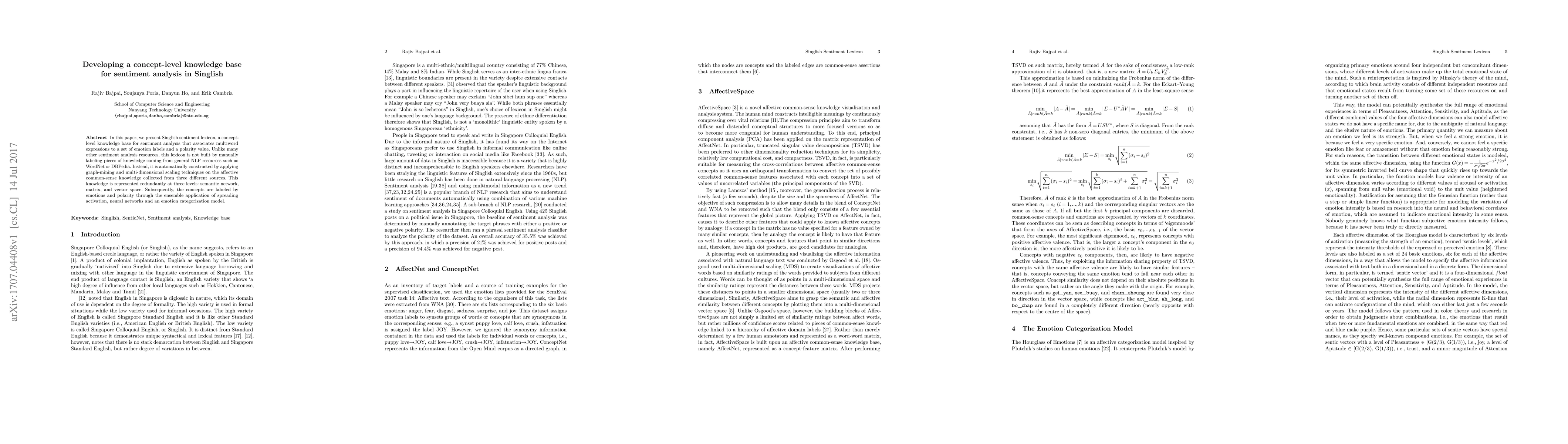 In this paper, we present Singlish sentiment lexicon, a concept-level knowledge base for sentiment analysis that associates multiword expressions to a set of emotion labels and a polarity value. Unlike many other sentiment analysis resources, this lexicon is not built by manually labeling pieces of knowledge coming from general NLP resources such as WordNet or DBPedia. Instead, it is automatically constructed by applying graph-mining and multi-dimensional scaling techniques on the affective common-sense knowledge collected from three different sources. This knowledge is represented redundantly at three levels: semantic network, matrix, and vector space. Subsequently, the concepts are labeled by emotions and polarity through the ensemble application of spreading activation, neural networks and an emotion categorization model.