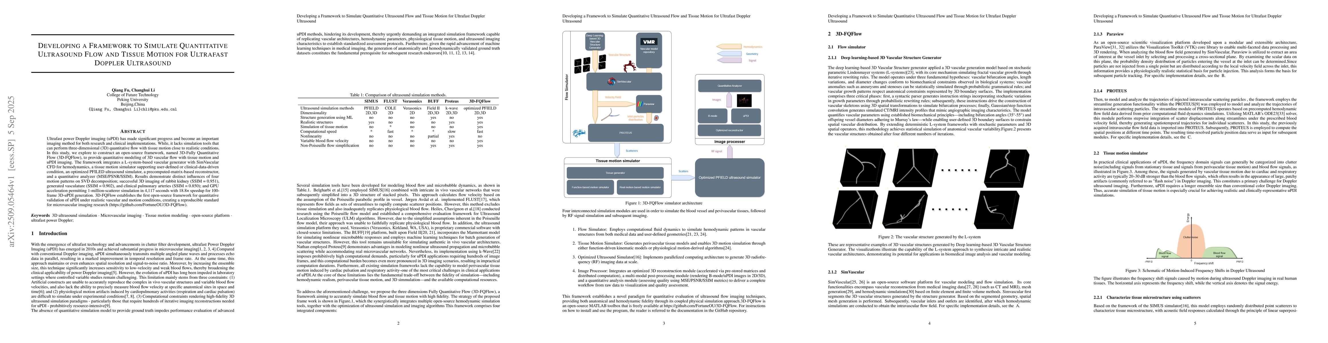 Ultrafast power Doppler imaging (uPDI) has made significant progress and become an important imaging method for both research and clinical implementations. While, it lacks simulation tools that can perform three-dimensional (3D) quantitative flow with tissue motion close to realistic conditions. In this study, we explore to construct an open-source framework, named 3D-Fully Quantitative Flow (3D-FQFlow), to provide quantitative modeling of 3D vascular flow with tissue motion and uPDI imaging. The framework integrates a L-system-based vascular generator with SimVascular CFD for hemodynamics, a tissue motion simulator supporting user-defined or clinical-data-driven condition, an optimized PFILED ultrasound simulator, a precomputed-matrix-based reconstructor, and a quantitative analyzer (MSE/PSNR/SSIM). Results demonstrate distinct influences of four motion patterns on SVD decomposition; successful 3D imaging of rabbit kidney (SSIM = 0.951), generated vasculature (SSIM = 0.902), and clinical pulmonary arteries (SSIM = 0.850); and GPU acceleration permitting 1-million-scatterer simulation in 4,117 seconds with 18.8* speedup for 100-frame 3D-uPDI generation. 3D-FQFlow establishes the first open-source framework for quantitative validation of uPDI under realistic vascular and motion conditions, creating a reproducible standard for microvascular imaging research (https://github.com/FortuneOU/3D-FQFlow).
