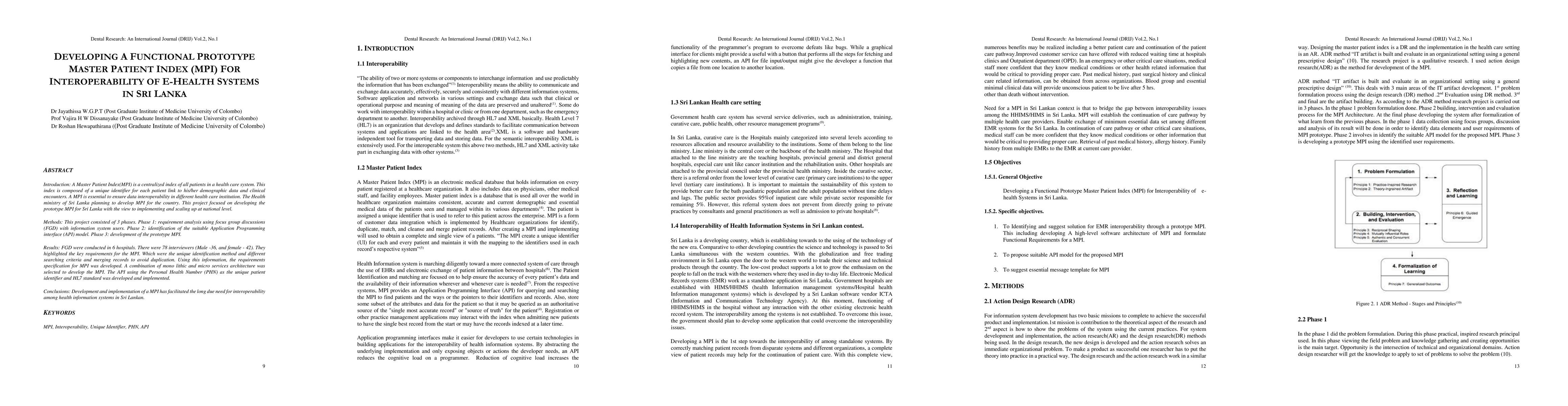 Introduction: A Master Patient Index(MPI) is a centralized index of all patients in a healthcare system. This index is composed of a unique identifier for each patient link to his/her demographic data and clinical encounters. A MPI is essential to ensure data interoperability in the different healthcare institution. The The health ministry of Sri Lanka planning to develop MPI for the country. This project focused on developing the prototype MPI for Sri Lanka with the view to implementing and scaling up at the national level. Methods: This project consisted of 3 phases. Phase 1: requirement analysis using focus group discussions (FGD) with information system users. Phase 2: identification of the suitable Application Programming interface (API) model. Phase 3: development of the prototype MPI. Results: FGD were conducted in 6 hospitals. There were 78 interviewers (Male -36, and female - 42). They highlighted the key requirements for the MPI. Which were the unique identification method and different searching criteria and merging records to avoid duplication. Using this information, the requirements specification for MPI was developed. A combination of monolithic and microservices architecture was selected to develop the MPI. The API using the Personal Health Number (PHN) as the unique patient identifier and HL7 standard was developed and implemented. Conclusions: Development and implementation of a MPI has facilitated the long due need for interoperability among health information systems in Sri Lankan. KEYWORDS MPI, Interoperability, Unique Identifier, PHN, API
