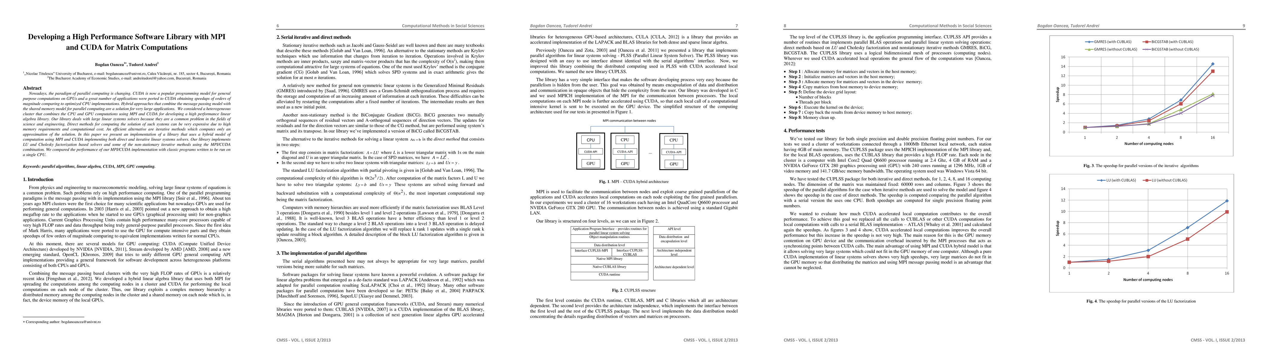 This paper develops a high-performance software library combining MPI and CUDA for matrix computations, focusing on both direct and iterative linear systems solvers to address large-scale problems in science and engineering. The performance of the hybrid MPI/CUDA implementation is compared against traditional single CPU programs.
