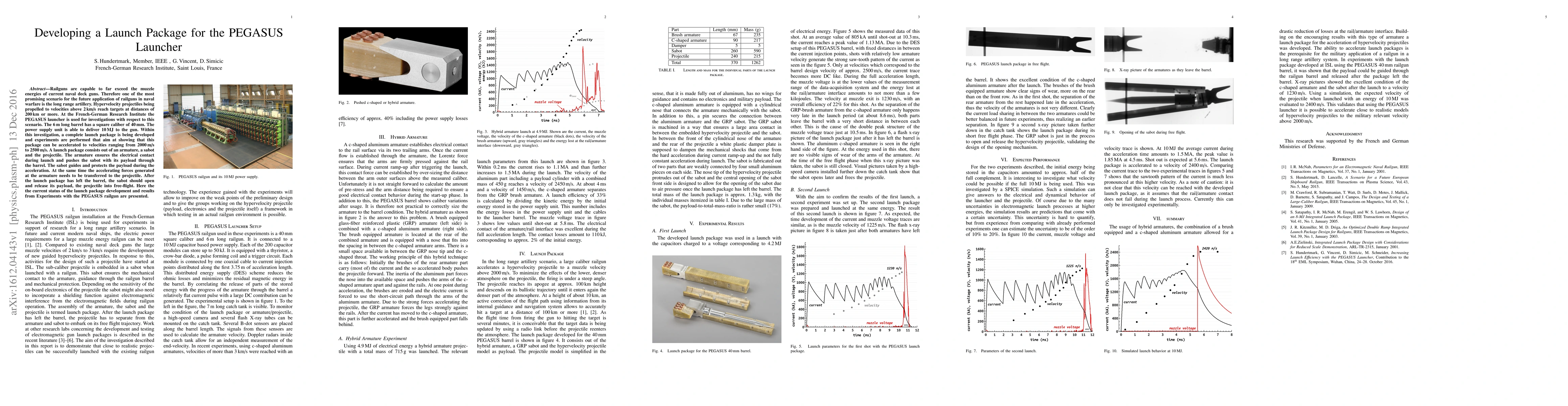 This paper explores the development of a launch package for the PEGASUS railgun, designed to accelerate projectiles to hypervelocity speeds exceeding 2 km/s for long-range artillery. The package includes an armature, sabot, and projectile, with experiments demonstrating its capability to achieve velocities from 2000 m/s to 2500 m/s.