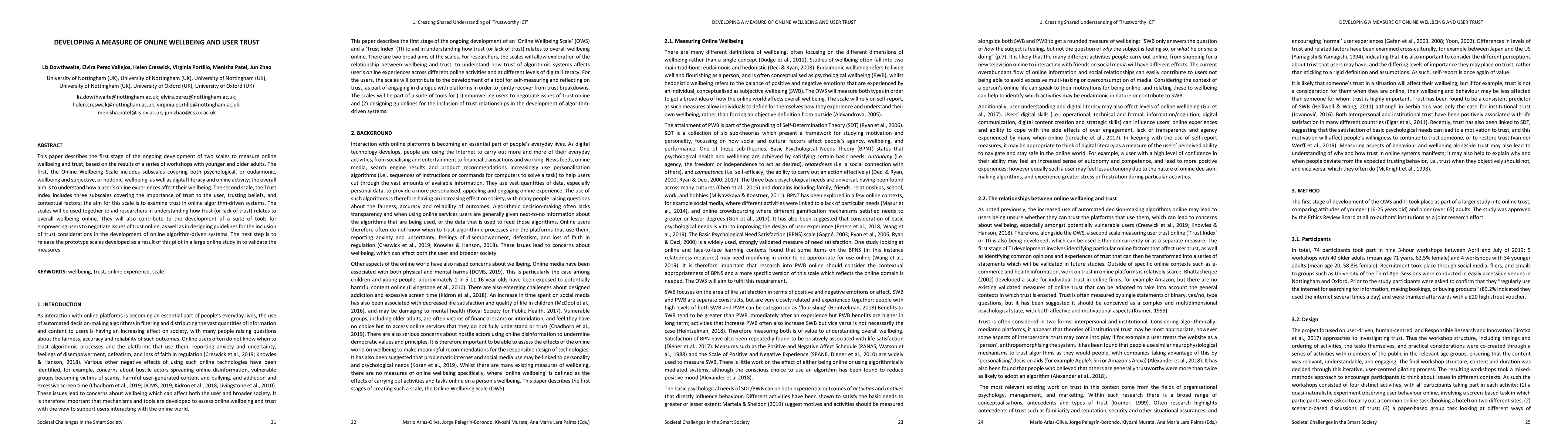 This paper describes the first stage of the ongoing development of two scales to measure online wellbeing and trust, based on the results of a series of workshops with younger and older adults. The first, the Online Wellbeing Scale includes subscales covering both psychological, or eudaimonic, wellbeing and subjective, or hedonic, wellbeing, as well as digital literacy and online activity; the overall aim is to understand how a user's online experiences affect their wellbeing. The second scale, the Trust Index includes three subscales covering the importance of trust to the user, trusting beliefs, and contextual factors; the aim for this scale is to examine trust in online algorithm-driven systems. The scales will be used together to aid researchers in understanding how trust (or lack of trust) relates to overall wellbeing online. They will also contribute to the development of a suite of tools for empowering users to negotiate issues of trust online, as well as in designing guidelines for the inclusion of trust considerations in the development of online algorithm-driven systems. The next step is to release the prototype scales developed as a result of this pilot in a large online study in to validate the measures.