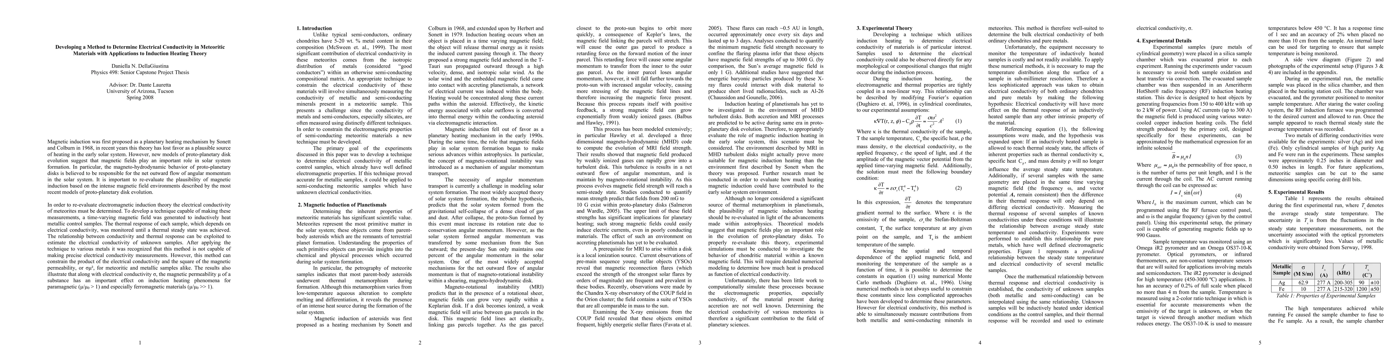 Magnetic induction was first proposed as a planetary heating mechanism by Sonett and Colburn in 1968, in recent years this theory has lost favor as a plausible source of heating in the early solar system. However, new models of proto-planetary disk evolution suggest that magnetic fields play an important role in solar system formation. In particular, the magneto-hydrodynamic behavior of proto-planetary disks is believed to be responsible for the net outward flow of angular momentum in the solar system. It is important to re-evaluate the plausibility of magnetic induction based on the intense magnetic field environments described by the most recent models of proto-planetary disk evolution. In order to re-evaluate electromagnetic induction theory the electrical conductivity of meteorites must be determined. To develop a technique capable of making these measurements, a time-varying magnetic field was generated to inductively heat metallic control samples. The thermal response of each sample, which depends on electrical conductivity, was monitored until a thermal steady state was achieved. The relationship between conductivity and thermal response can be exploited to estimate the electrical conductivity of unknown samples. After applying the technique to various metals it was recognized that this method is not capable of making precise electrical conductivity measurements. However, this method can constrain the product of the electrical conductivity and the square of the magnetic permeability, or ${\sigma}{{\mu}^2}$, for meteoritic and metallic samples alike. The results also illustrate that along with electrical conductivity {\sigma}, the magnetic permeability {\mu} of a substance has an important effect on induction heating phenomena for paramagnetic ({\mu}/{\mu}0 > 1) and especially ferromagnetic materials ({\mu}/{\mu}0 >> 1).