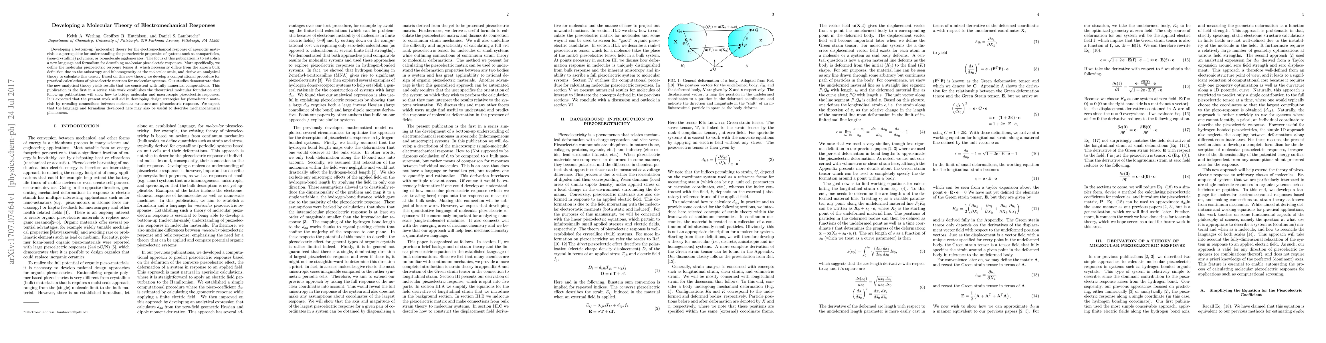 Developing a bottom-up (molecular) theory for the electromechanical response of aperiodic materials is a prerequisite for understanding the piezoelectric properties of systems such as nanoparticles, (non-crystalline) polymers, or biomolecule agglomerates. The focus of this publication is to establish a new language and formalism for describing molecular piezoelectric responses. More specifically, we define the molecular piezoelectric response tensor d, which necessarily differs from the known bulk definition due to the anisotropy and inhomogeneity at the molecular scale, and derive an analytical theory to calculate this tensor. Based on this new theory, we develop a computational procedure for practical calculations of piezoelectric matrices for molecular systems. Our studies demonstrate that the new analytical theory yields results that are consistent with fully numerical computations. This publication is the first in a series; this work establishes the theoretical molecular foundation and follow-up publications will show how to bridge molecular and macroscopic piezoelectric responses. It is expected that the present work will aid in developing design strategies for piezoelectric materials by revealing connections between molecular structure and piezoelectric response. We expect that the language and formalism developed here may also be useful to describe mechanochemical phenomena.