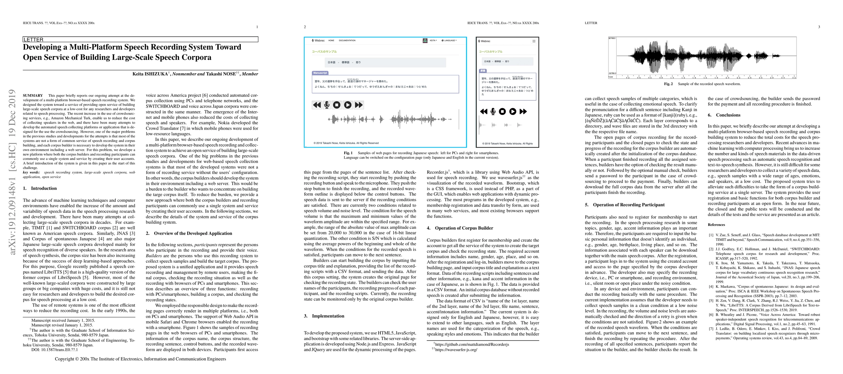 This paper details the development of a multi-platform, browser-based speech recording system aimed at providing an affordable service for constructing large-scale speech corpora. The system addresses previous limitations by offering a common platform for both corpus builders and participants, eliminating the need for individual web server setups.