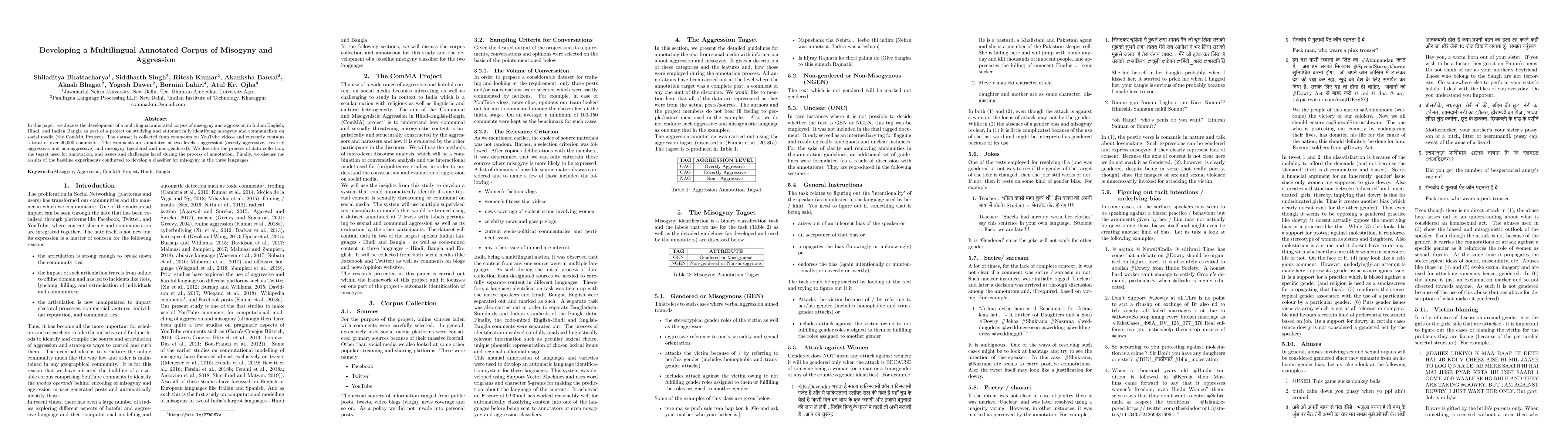 This paper details the creation of a multilingual annotated corpus of misogyny and aggression in Indian English, Hindi, and Bangla, collected from YouTube comments. The corpus is annotated for aggression and misogyny, and the paper discusses the challenges faced during annotation and initial classifier results.