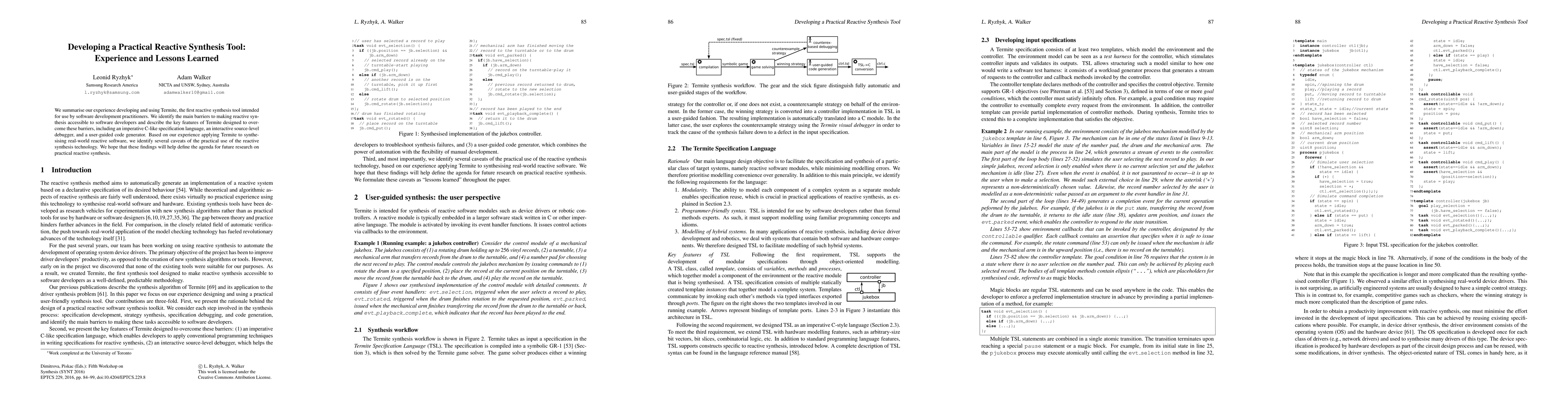 This paper details the development and practical use of Termite, a reactive synthesis tool for software developers, highlighting its features like an imperative C-like specification language and an interactive debugger. The authors discuss challenges encountered in real-world applications and propose these insights to guide future research in practical reactive synthesis.