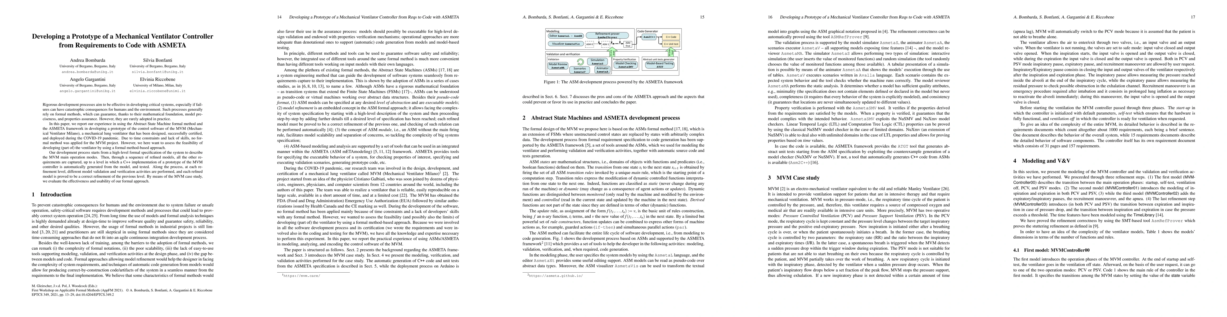 This paper explores the application of the Abstract State Machine formal method and the ASMETA framework to develop a prototype control software for the MVM mechanical ventilator, emphasizing the feasibility of using formal methods in critical system development. The authors demonstrate a rigorous development process from high-level formal specifications to an automatically generated C++ prototype, highlighting the effectiveness and validation of their formal approach through the MVM case study.