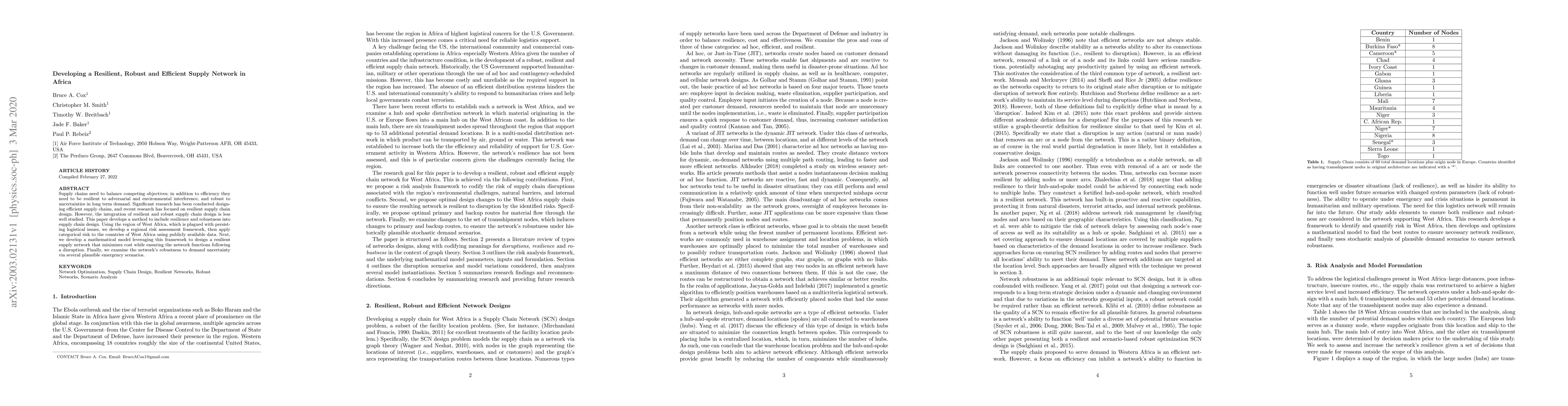 This paper proposes a method for designing resilient and robust supply networks in West Africa, integrating risk assessment and mathematical modeling to minimize costs while ensuring functionality post-disruption. It evaluates the network's robustness against demand uncertainties through plausible emergency scenarios.