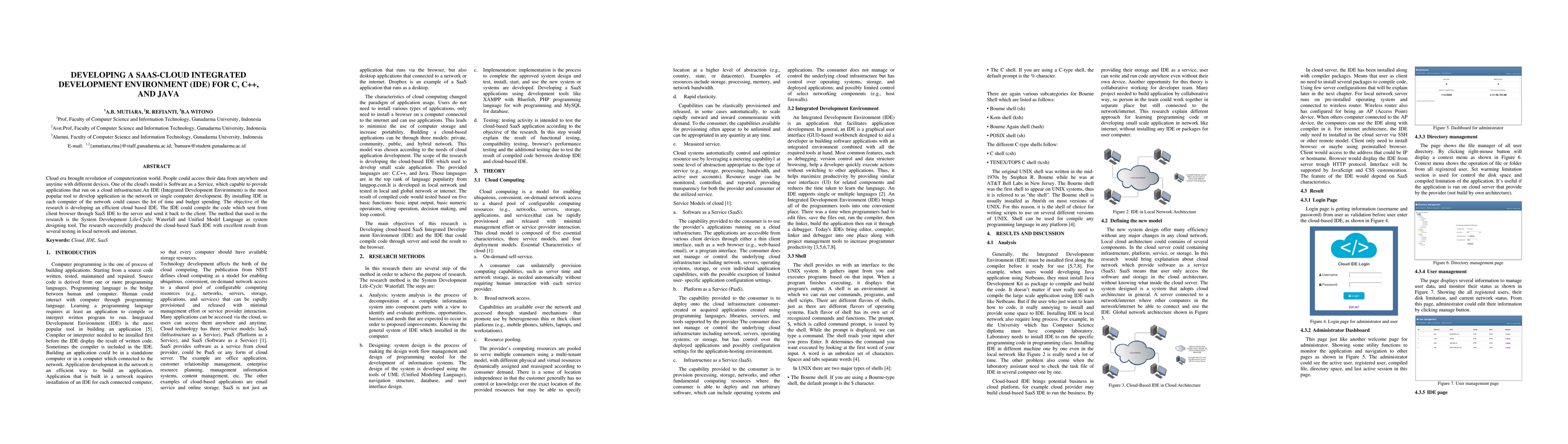 This research develops a cloud-based SaaS IDE for C, C++, and Java, aiming to eliminate the need for local installations. Using the Waterfall model and Unified Model Language, the study successfully created an efficient cloud IDE that compiles code sent from client browsers and returns results.