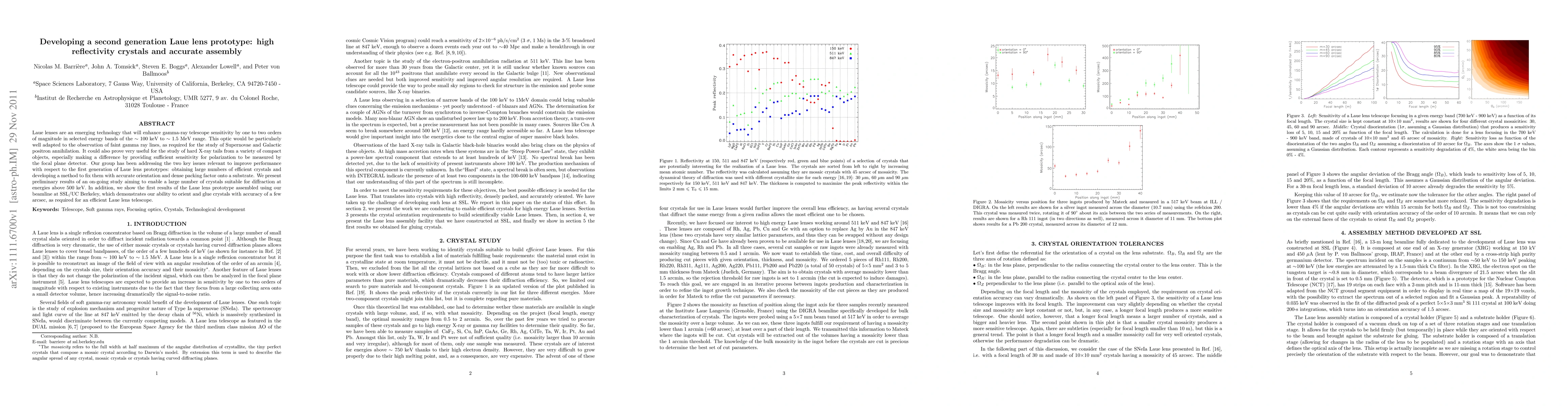 Laue lenses are an emerging technology that will enhance gamma-ray telescope sensitivity by one to two orders of magnitude in selected energy bands of the \sim 100 keV to \sim 1.5 MeV range. This optic would be particularly well adapted to the observation of faint gamma ray lines, as required for the study of Supernovae and Galactic positron annihilation. It could also prove very useful for the study of hard X-ray tails from a variety of compact objects, especially making a difference by providing sufficient sensitivity for polarization to be measured by the focal plane detector. Our group has been addressing the two key issues relevant to improve performance with respect to the first generation of Laue lens prototypes: obtaining large numbers of efficient crystals and developing a method to fix them with accurate orientation and dense packing factor onto a substrate. We present preliminary results of an on-going study aiming to enable a large number of crystals suitable for diffraction at energies above 500 keV. In addition, we show the first results of the Laue lens prototype assembled using our beamline at SSL/UC Berkeley, which demonstrates our ability to orient and glue crystals with accuracy of a few arcsec, as required for an efficient Laue lens telescope.
