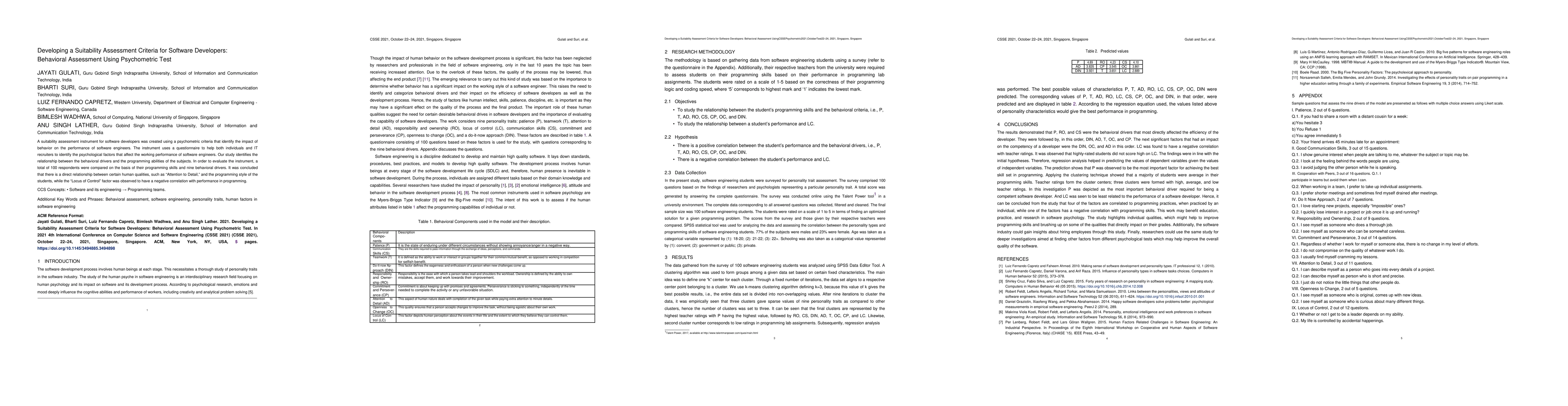 This paper proposes a new suitability assessment criteria for software developers based on behavioral analysis using psychometric tests. The study aims to identify the most effective tools and methodologies for evaluating developers' cognitive and behavioral traits to enhance recruitment and team formation.