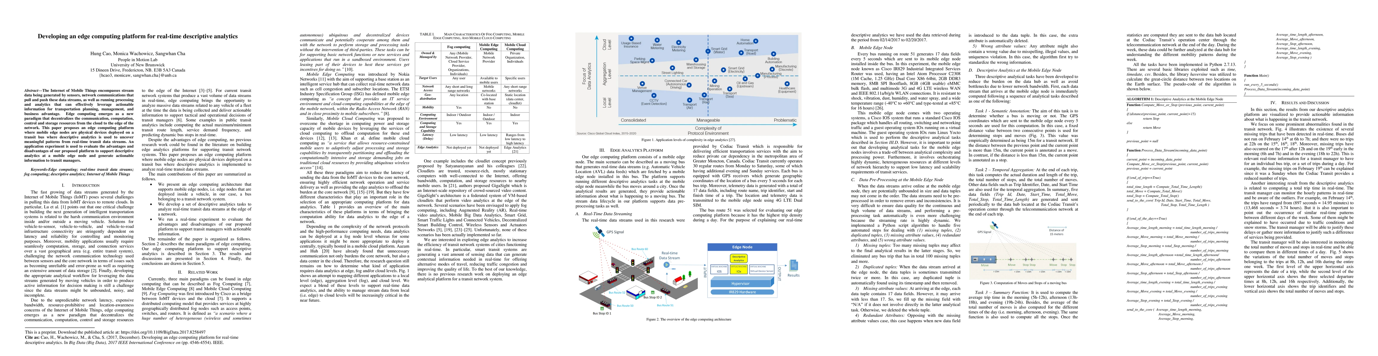 This paper proposes an edge computing platform deployed on transit buses to perform real-time descriptive analytics on transit data streams, aiming to uncover meaningful patterns and generate actionable information for transportation management. An experimental application assesses the platform's effectiveness and challenges in supporting decentralized analytics.