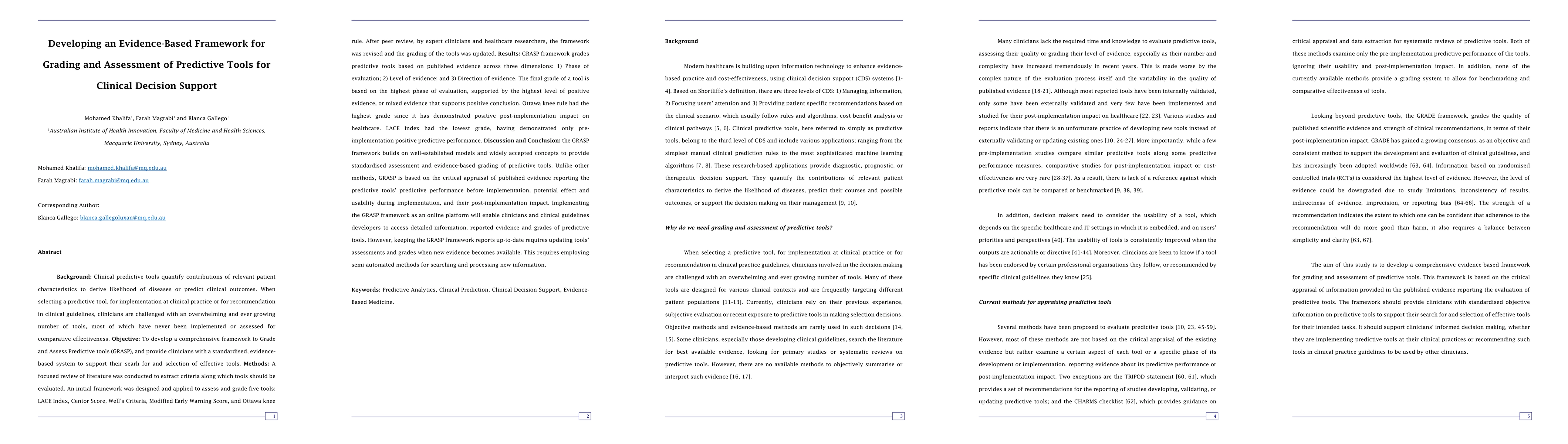 The paper develops the GRASP framework to standardize the assessment and grading of clinical predictive tools based on published evidence, evaluating them across three dimensions: evaluation phase, level of evidence, and direction of evidence. The framework aims to assist clinicians in selecting effective tools by providing a comprehensive, evidence-based system.
