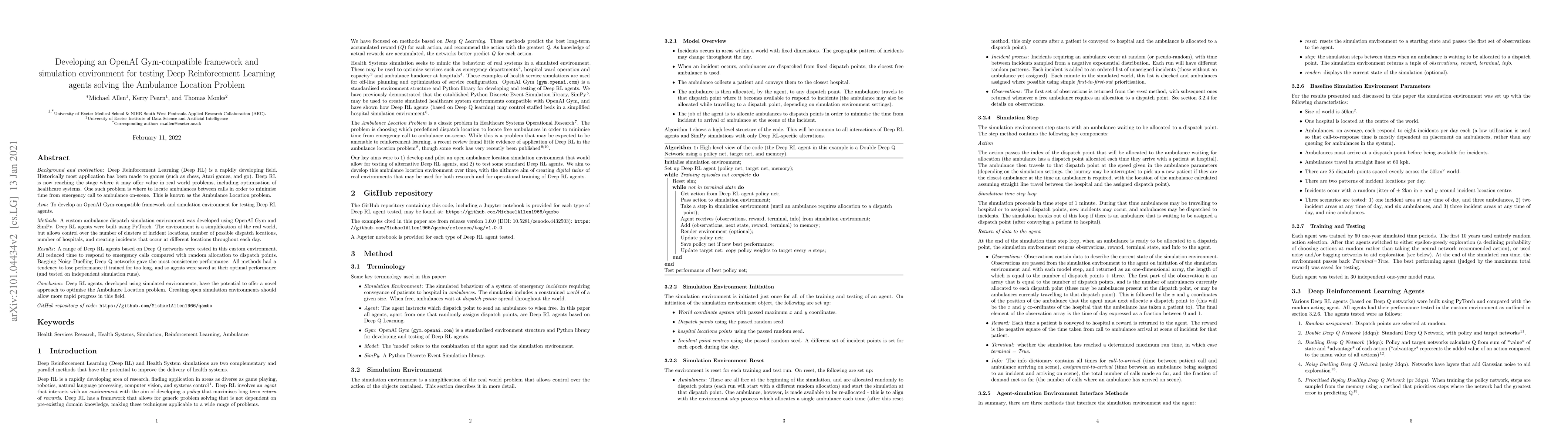This paper develops an OpenAI Gym-compatible simulation environment for testing Deep Reinforcement Learning agents in solving the Ambulance Location Problem, showing that such agents can optimize emergency response times compared to random dispatch. The study highlights the potential of Deep RL for real-world applications and the benefits of open simulation environments for rapid progress.