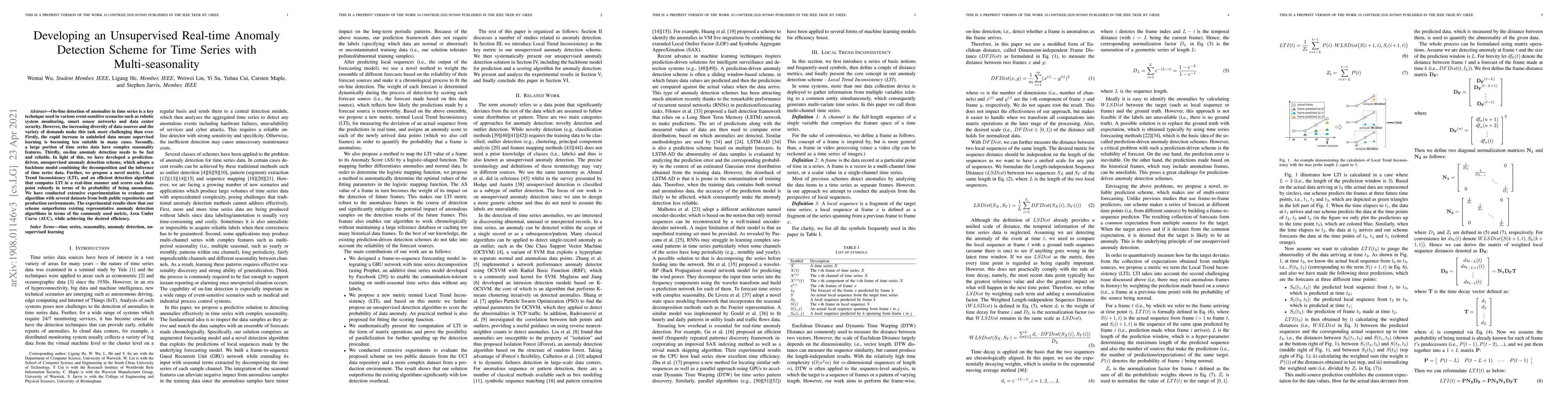 This paper develops an unsupervised real-time anomaly detection scheme for time series data with multi-seasonality, employing a prediction-driven approach and a novel Local Trend Inconsistency (LTI) metric. The proposed method outperforms existing algorithms in anomaly detection accuracy while maintaining efficiency.