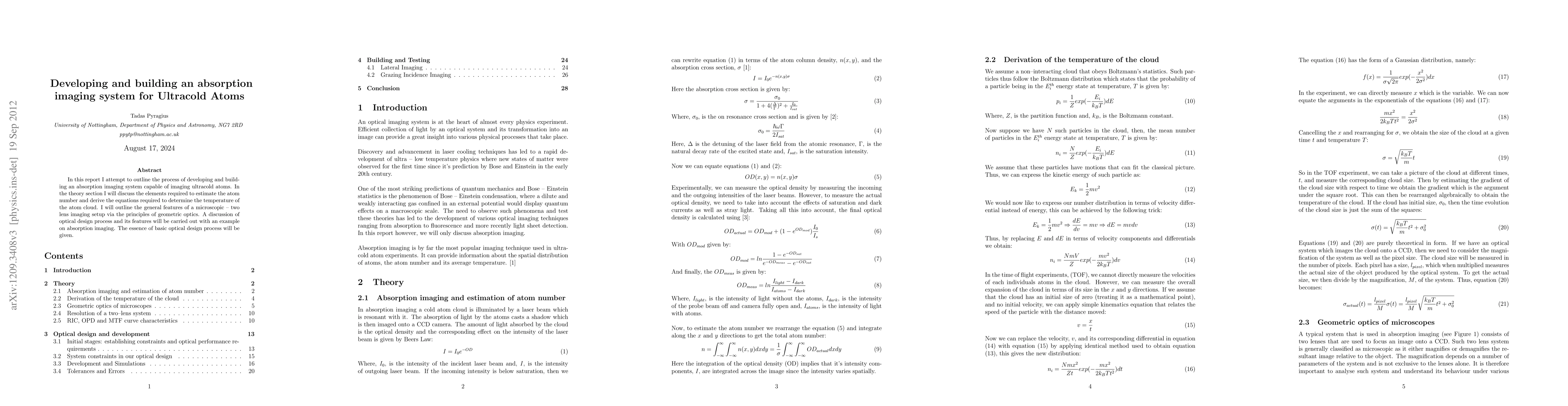 This research paper details the development of an absorption imaging system for ultracold atoms, outlining the theoretical framework for estimating atom number and determining temperature, and discussing the optical design process for a two-lens microscopic imaging setup using geometric optics principles.