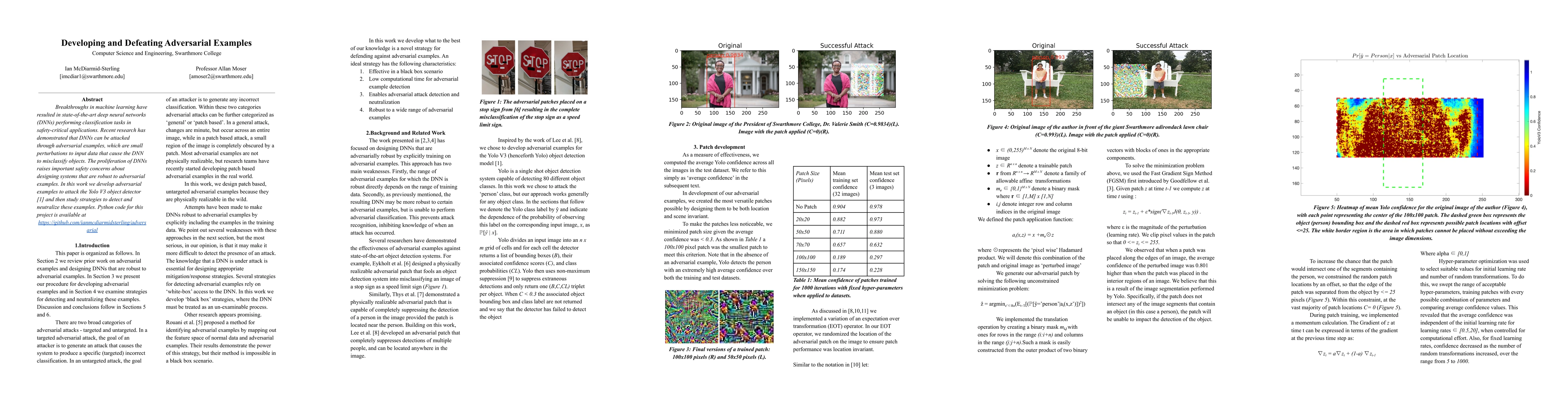 Breakthroughs in machine learning have resulted in state-of-the-art deep neural networks (DNNs) performing classification tasks in safety-critical applications. Recent research has demonstrated that DNNs can be attacked through adversarial examples, which are small perturbations to input data that cause the DNN to misclassify objects. The proliferation of DNNs raises important safety concerns about designing systems that are robust to adversarial examples. In this work we develop adversarial examples to attack the Yolo V3 object detector [1] and then study strategies to detect and neutralize these examples. Python code for this project is available at https://github.com/ianmcdiarmidsterling/adversarial
