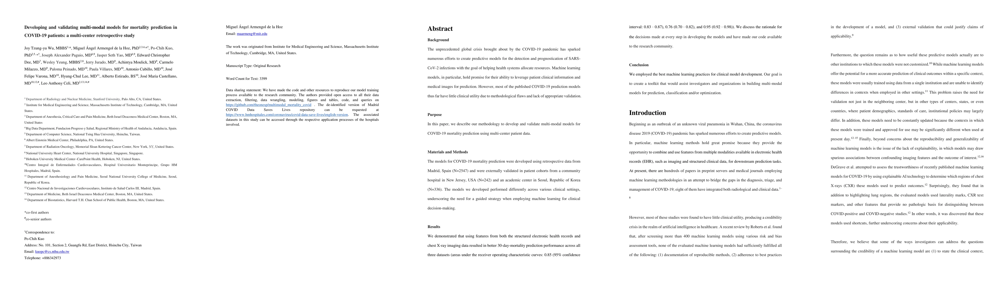 This study developed and validated multi-modal models for predicting 30-day mortality in COVID-19 patients using data from three diverse centers. The models, integrating both electronic health records and chest X-ray imaging, showed improved prediction accuracy across datasets, highlighting the potential of machine learning in clinical decision-making.