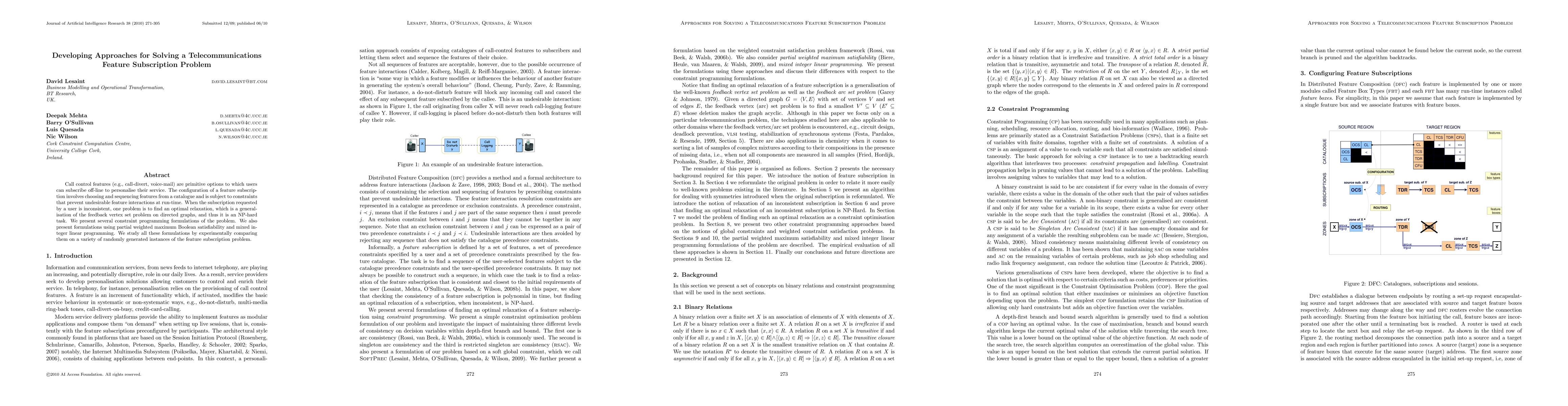 Call control features (e.g., call-divert, voice-mail) are primitive options to which users can subscribe off-line to personalise their service. The configuration of a feature subscription involves choosing and sequencing features from a catalogue and is subject to constraints that prevent undesirable feature interactions at run-time. When the subscription requested by a user is inconsistent, one problem is to find an optimal relaxation, which is a generalisation of the feedback vertex set problem on directed graphs, and thus it is an NP-hard task. We present several constraint programming formulations of the problem. We also present formulations using partial weighted maximum Boolean satisfiability and mixed integer linear programming. We study all these formulations by experimentally comparing them on a variety of randomly generated instances of the feature subscription problem.